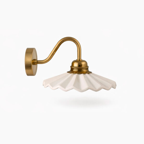 Aplique de pared en latón al natural con tulipa de Manises realizada a mano. Su diseño combina la calidez del metal sin tratar con la delicadeza de una pantalla cerámica ondulada, ligeramente irregular, que refleja el carácter único de las piezas hechas una a una.