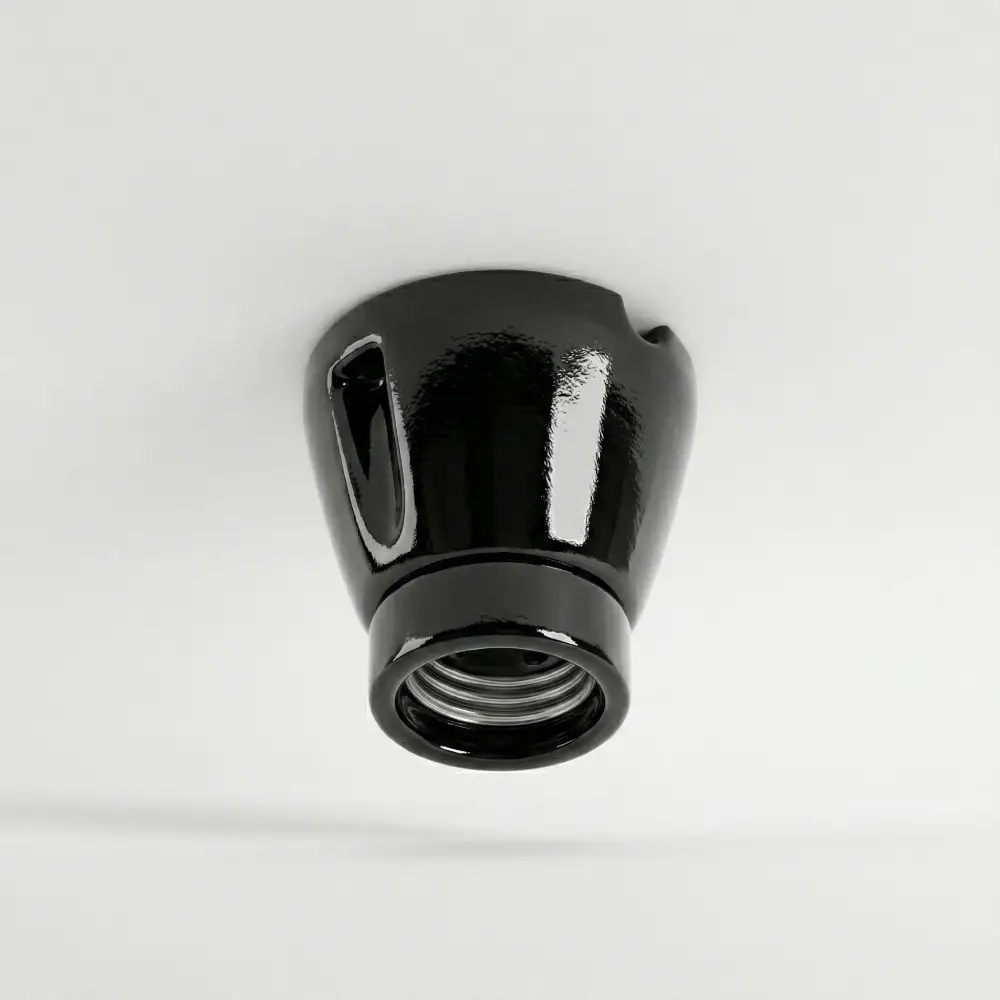 Aplique o punto de luz de techo realizado en cerámica con acabado en negro brillo, una opción elegante y con más presencia que su versión en blanco. Su diseño compacto y ligeramente cónico aporta un toque contemporáneo que encaja muy bien en interiores modernos, industriales o espacios donde se busque contraste.
