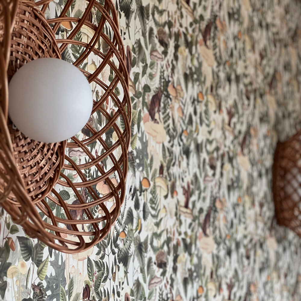 Aplique de mimbre elaborado por artesanos de tercera generación. El mimbre es de origen español y de primera calidad. Acabado buff (tostado). Tiene una tulipa esférica de cristal opal. Puedes ponerlo en pared y en techo. Al estar elaborado a mano, el color y el tamaño pueden variar ligeramente.