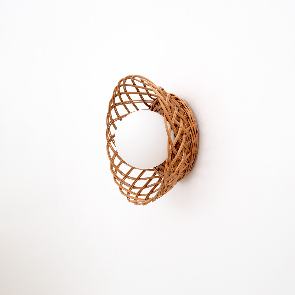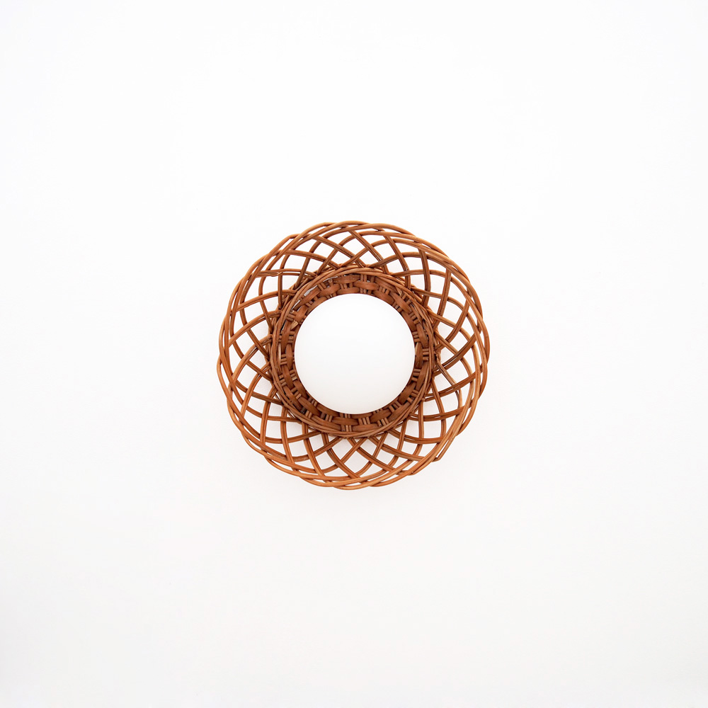 Aplique de mimbre elaborado por artesanos de tercera generación. El mimbre es de origen español y de primera calidad. Acabado buff (tostado). Tiene una tulipa esférica de cristal opal. Puedes ponerlo en pared y en techo. Al estar elaborado a mano, el color y el tamaño pueden variar ligeramente.