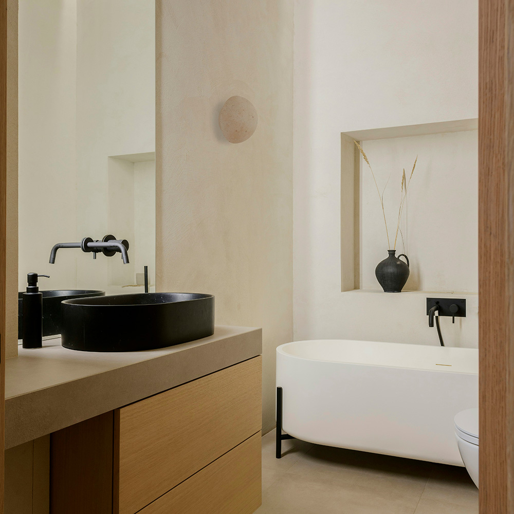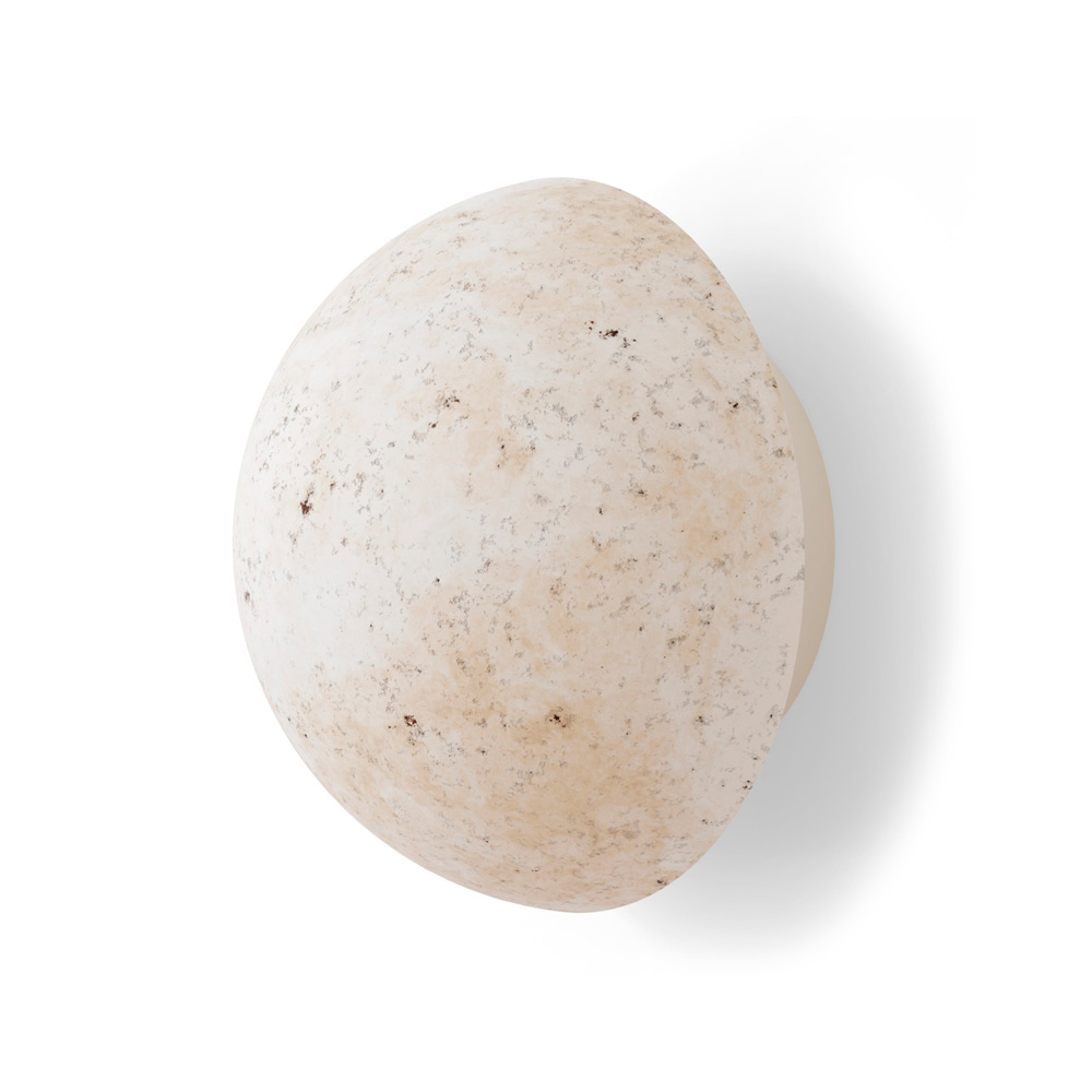 Aplique de pared Vita en travertino beige. Su luz integrada de 10W y su temperatura de color ajustable lo convierten en una opción versátil y sofisticada para cualquier espacio.