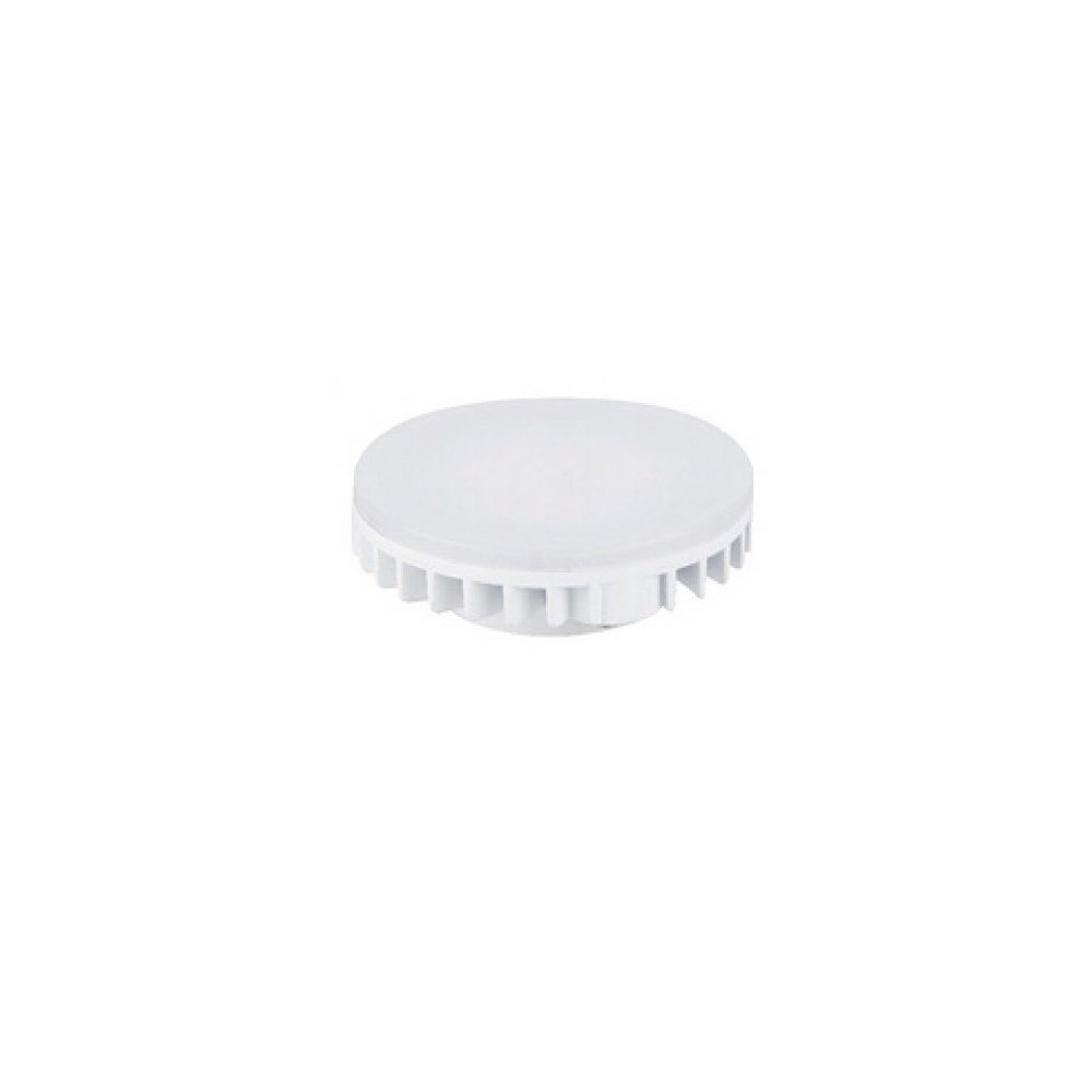 Bombilla LED GX53 9W 3000K con luz cálida y diseño plano, ideal para plafones o mobiliario. Fabricada en aluminio y policarbonato, ofrece 730 lúmenes de potencia luminosa.