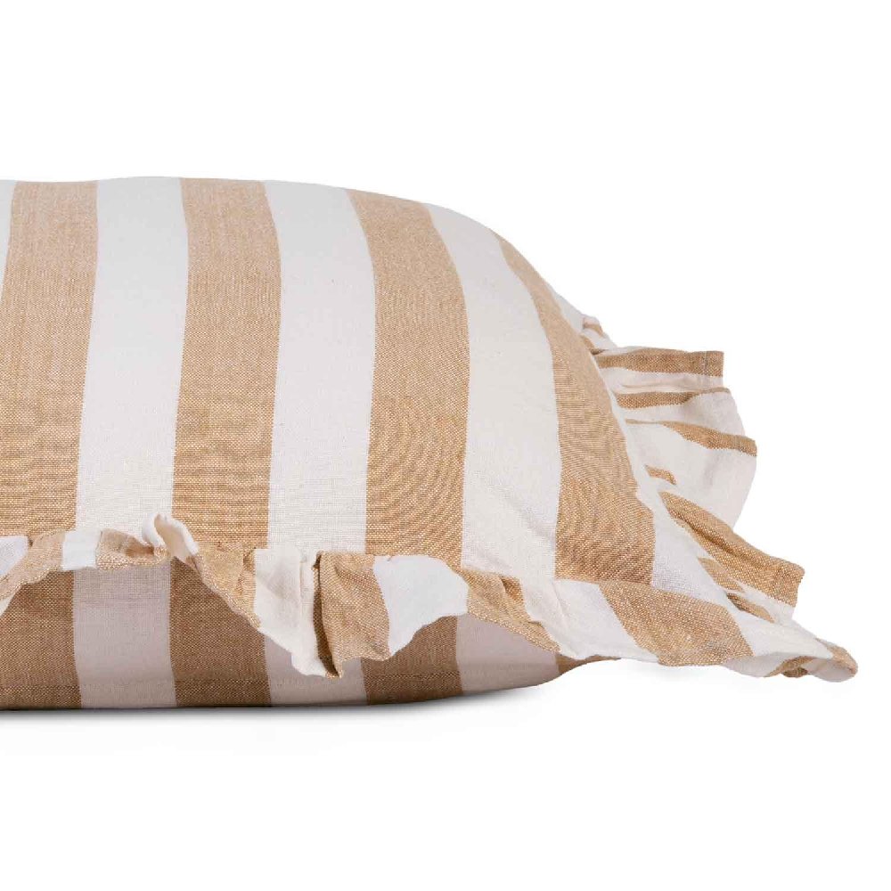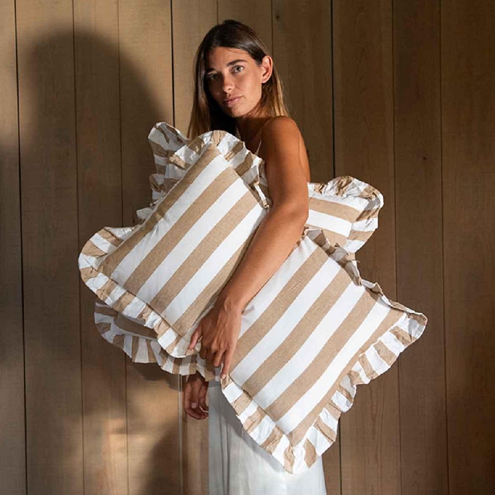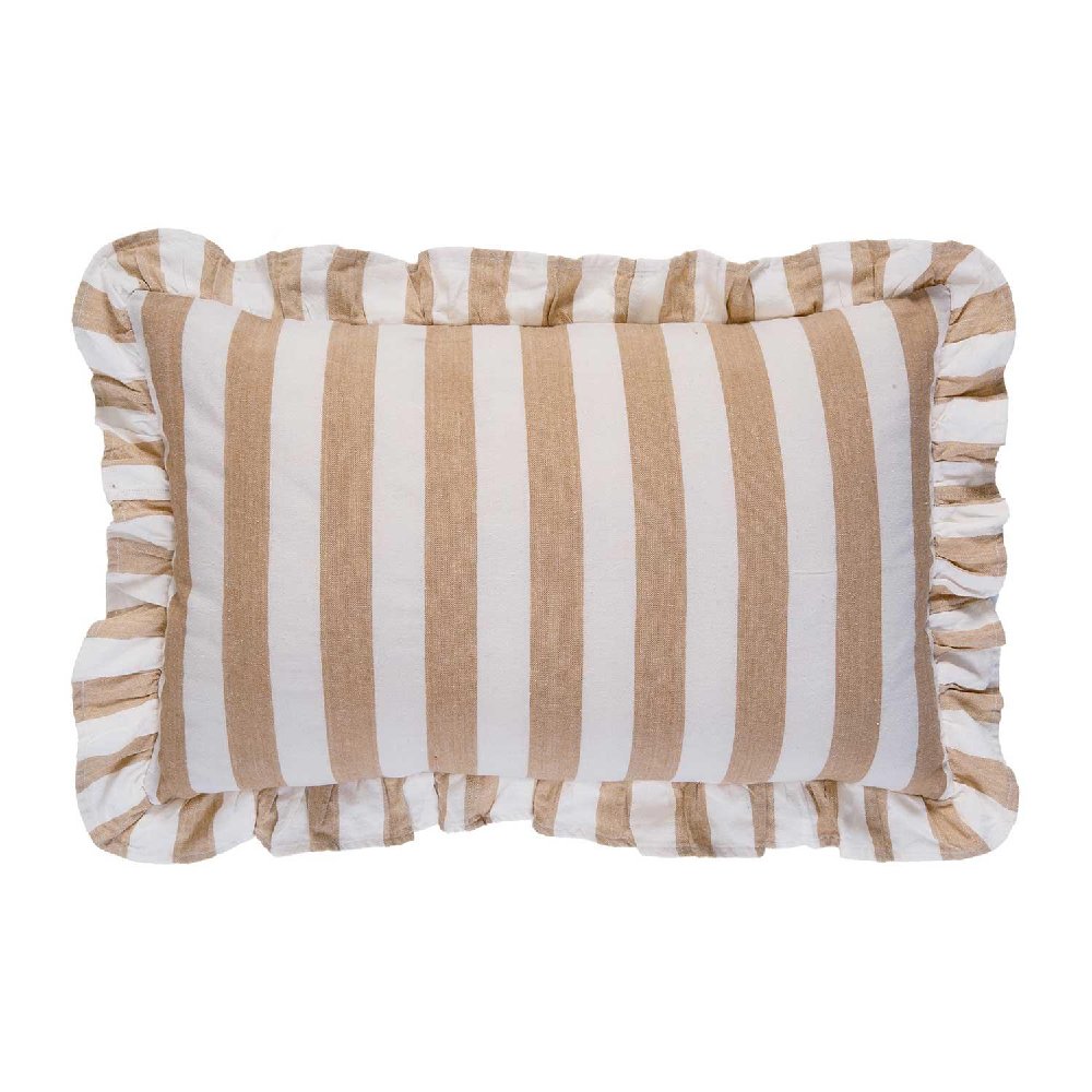 Cojín rectangular con volante y rayas en beige y blanco. Ideal para crear una atmósfera serena y luminosa en sofás, camas o rincones de lectura.