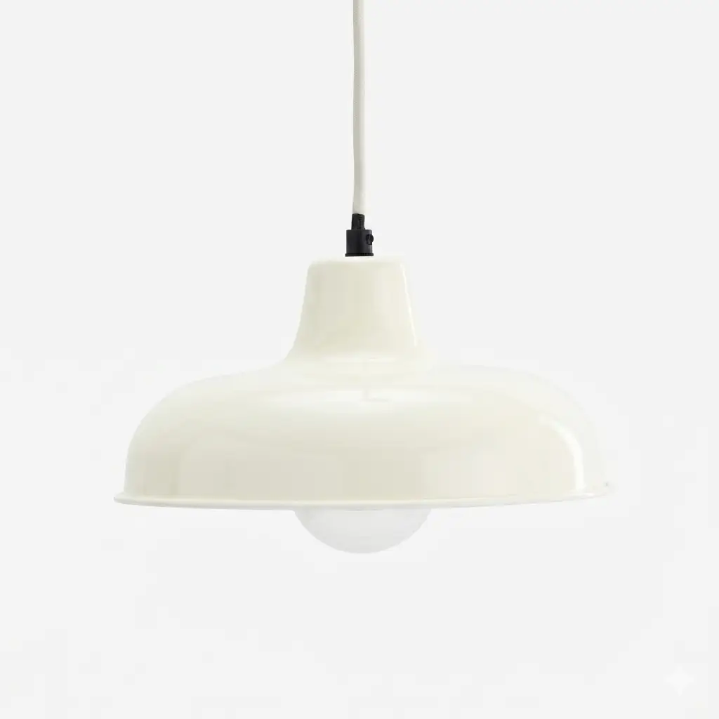 Lámpara colgante esmaltada en color marfil con un diseño clásico y funcional. Su forma de campana ancha proporciona una iluminación agradable, perfecta para cocinas y zonas de mesa.