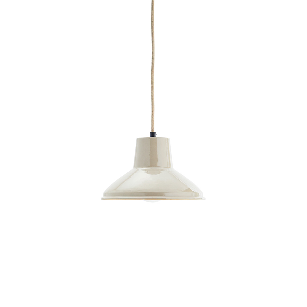 Lámpara colgante esmaltada en tono topo, con un diseño industrial actualizado que combina funcionalidad y estética. Su acabado brillante resalta su carácter atemporal, mientras que el cable de lino aporta un toque natural y cálido. Perfecta para iluminar comedores, cocinas o espacios de trabajo con estilo.