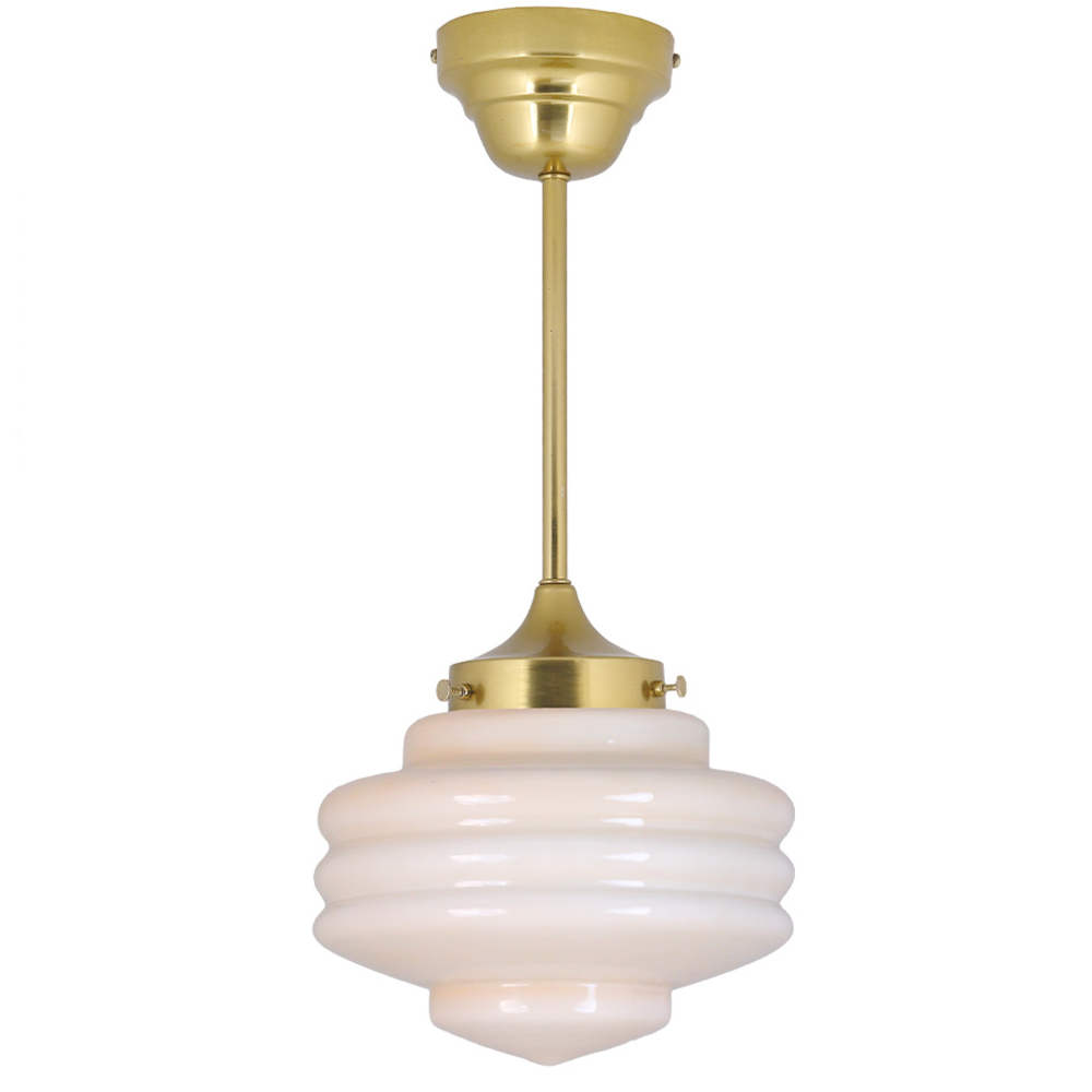 Lámpara colgante de techo en acabado latón con pantalla de vidrio opal beige. Perfecta para interiores que buscan un toque retro con estilo. Medidas: Ø 20 x H 49 cm. Bombilla E27 no incluida.