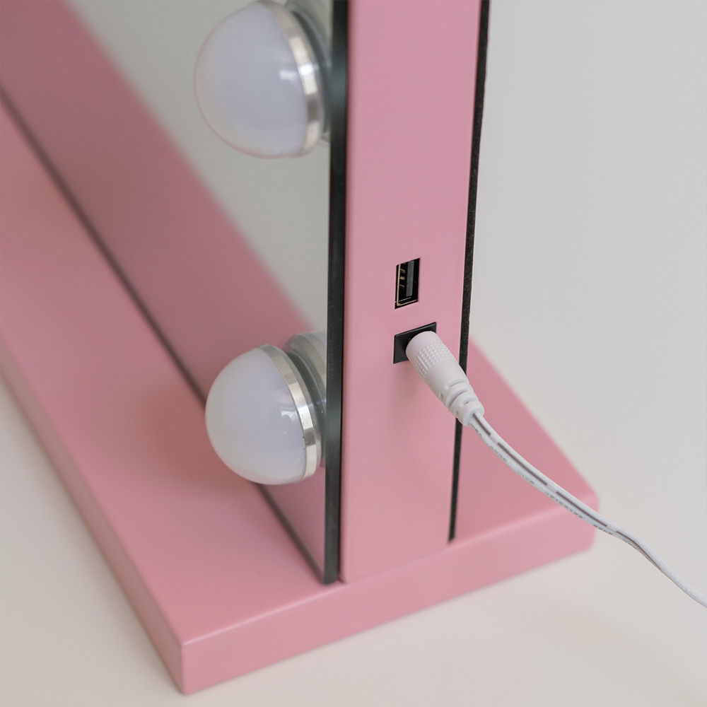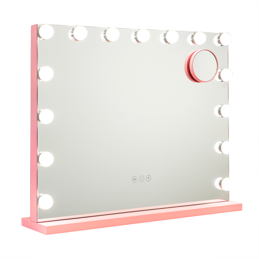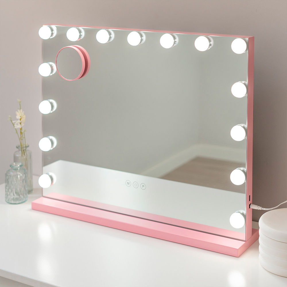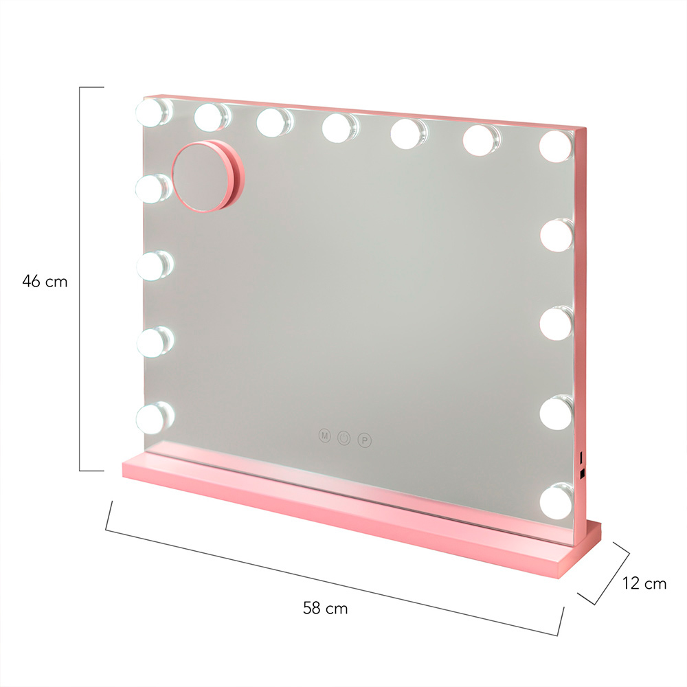 Espejo Kim en color rosa con 15 bombillas LED estilo hollywood y espejo de aumento x5 incluido. Luz regulable en intensidad y color (3 tonos).