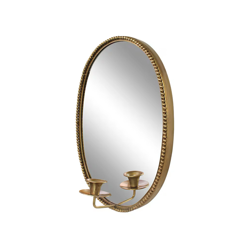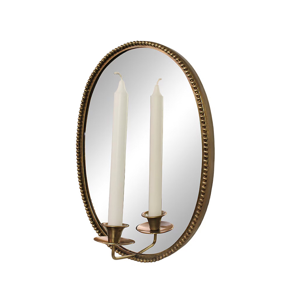 Espejo ovalado en latón envejecido con portavelas, perfecto para añadir un toque cálido y decorativo a entradas, salones y dormitorios. La luz de las velas se refleja en el espejo creando un ambiente suave y elegante.