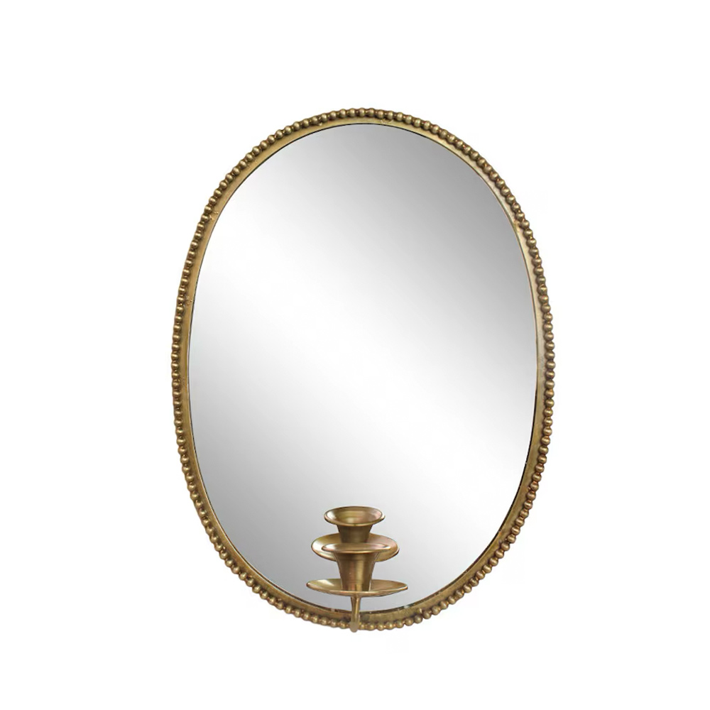 Espejo ovalado con un acabado en latón envejecido que aporta calidez y un toque vintage a cualquier pared. Su marco decorado con pequeños puntos en relieve añade textura y un aire artesanal. Incorpora un portavelas doble en la parte inferior