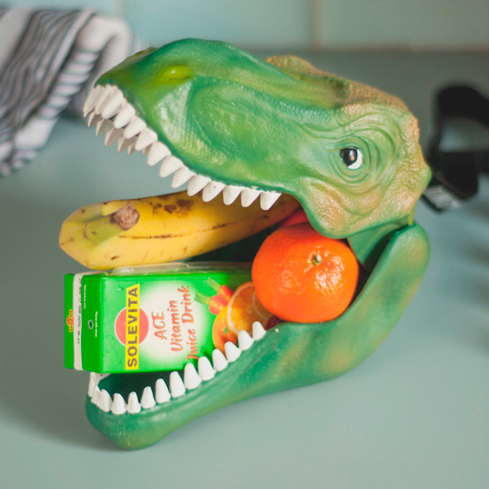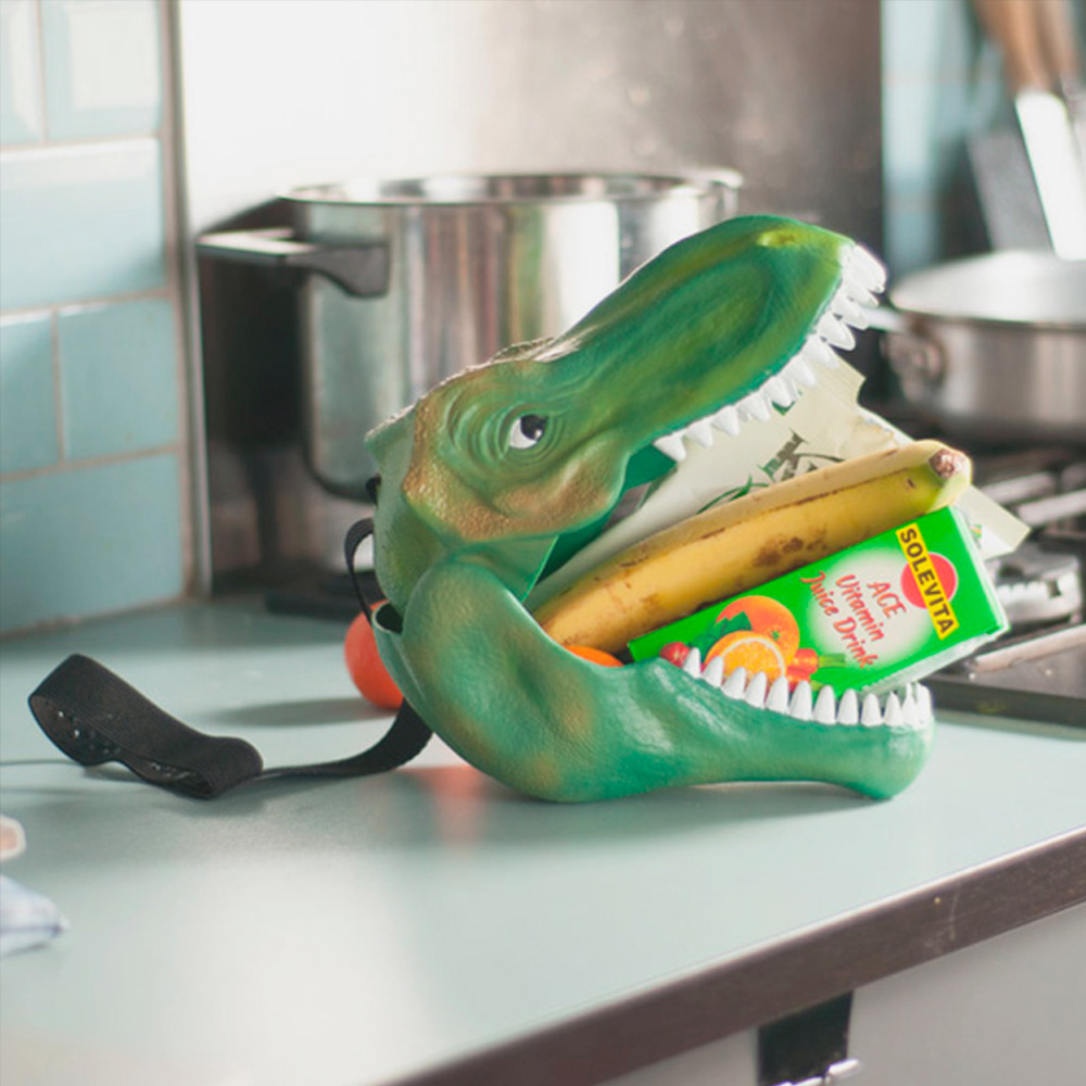 Una fiambrera divertida y práctica en forma de cabeza de dinosaurio. Fabricada en plástico con forro interior de silicona, para guardar el almuerzo, juguetes o material de escritorio dentro de sus fauces. Incluye un asa de tela que asegura el cierre y facilita el transporte. Perfecta para pequeños exploradores jurásicos o para quienes buscan una forma original de llevar sus cosas.