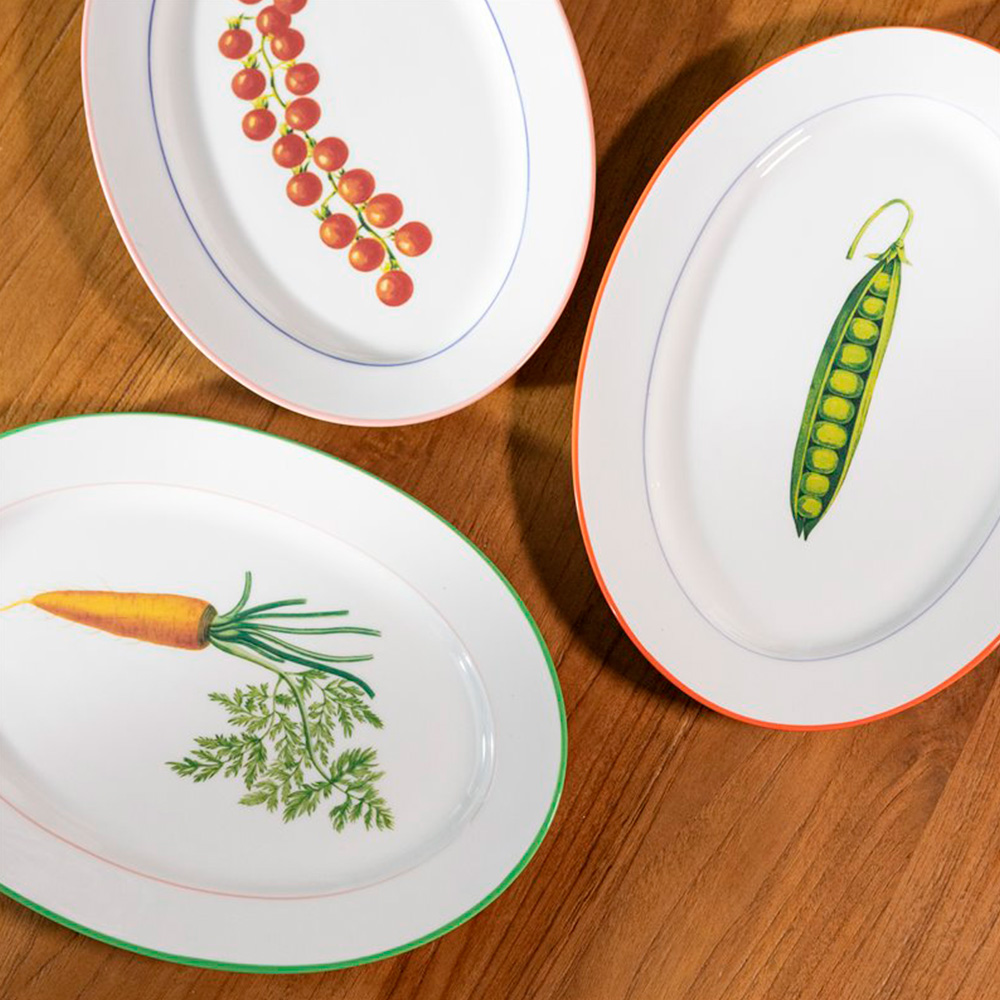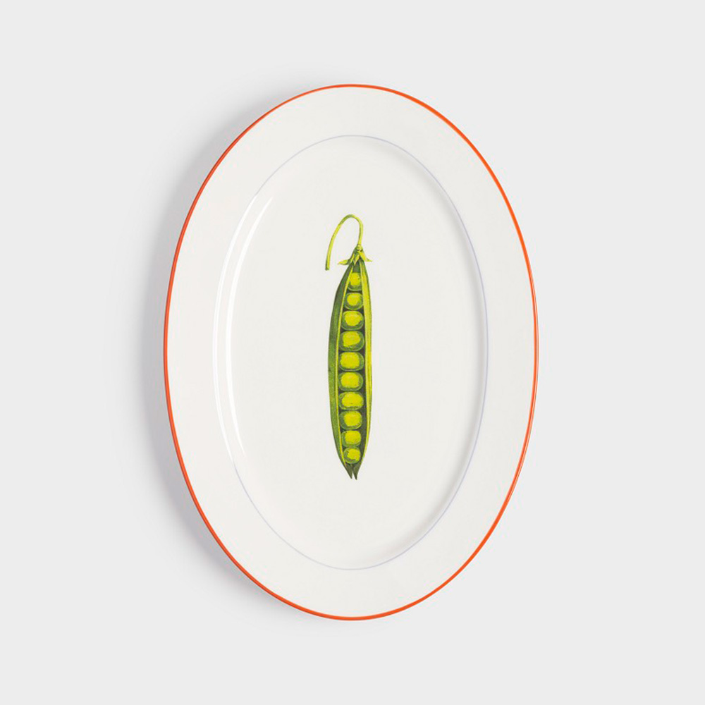 Plato ovalado de porcelana new bone china con ilustración de vaina de guisantes y borde rojo. Una pieza decorativa ideal para la cocina o para servir con encanto.