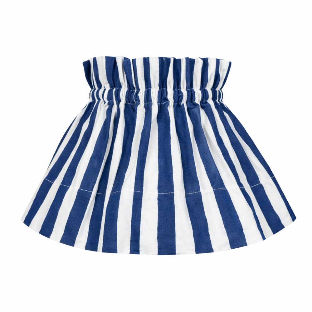 Funda de algodón 100% con estampado de rayas azules y blancas, pensada para vestir pantallas existentes y darles un aire fresco y estacional. El tejido está estampado artesanalmente en la India mediante técnica block print, lo que aporta un acabado irregular y único a cada pieza.