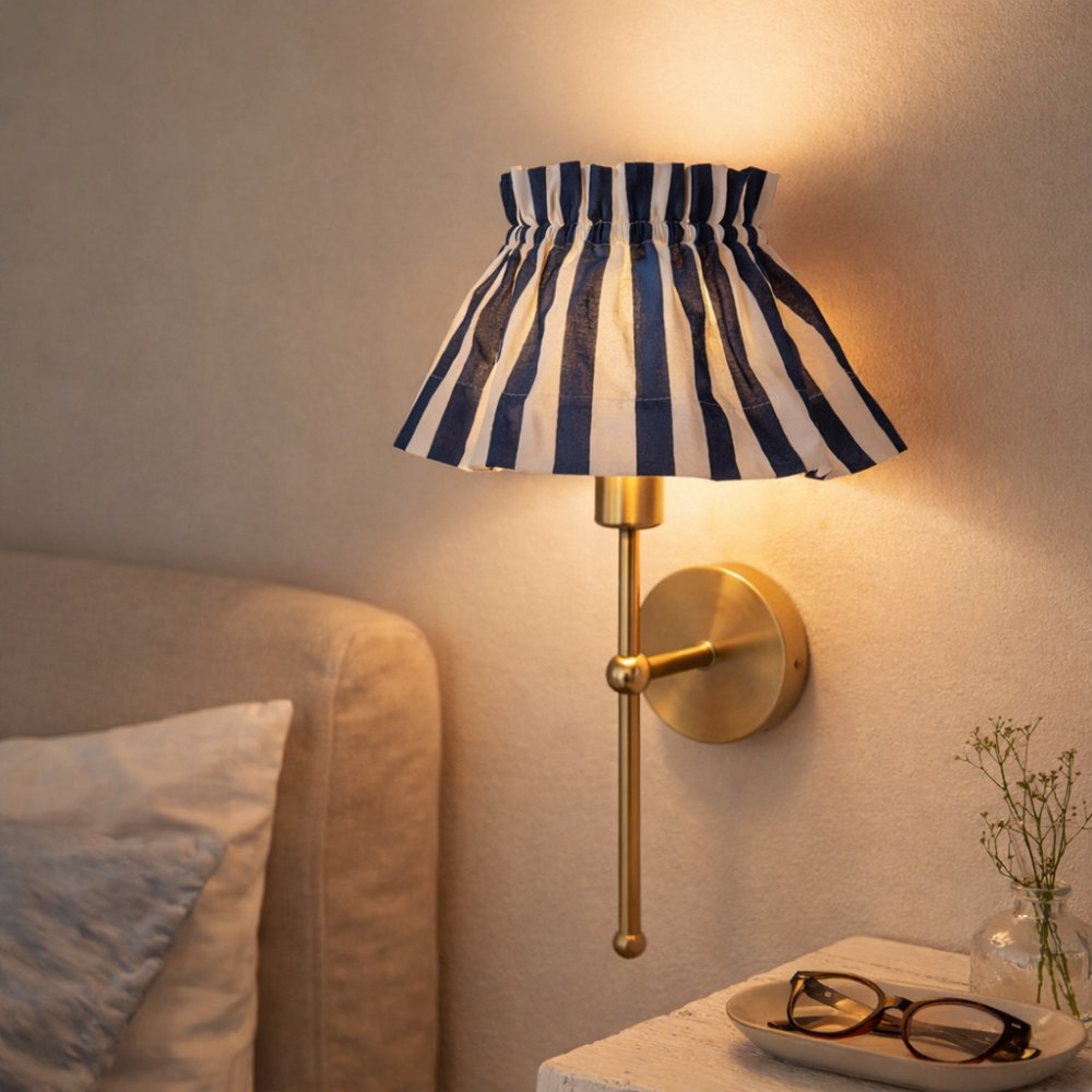 Funda de pantalla de algodón con rayas azules y blancas, estampada a mano en la India. Pensada para vestir pantallas pequeñas y medianas, es ideal para renovar lámparas de sobremesa y mesilla de forma sencilla y decorativa.