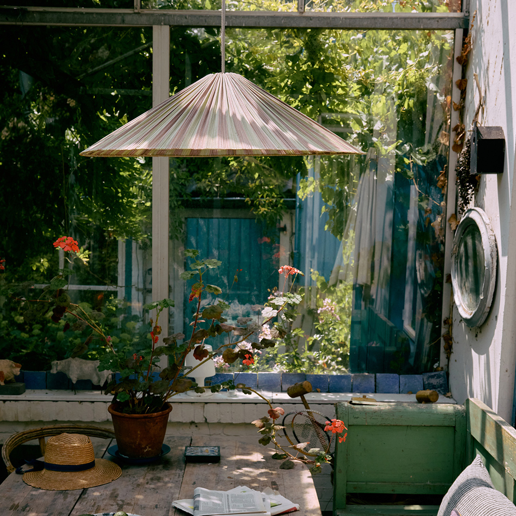 Su silueta amplia y ligera recuerda a las lámparas artesanales de inspiración setentera, pero con un enfoque contemporáneo. La luz se filtra suavemente a través del tejido, creando sombras delicadas y una atmósfera cálida y orgánica. Es una lámpara con presencia, pensada para convertirse en el punto focal del espacio.