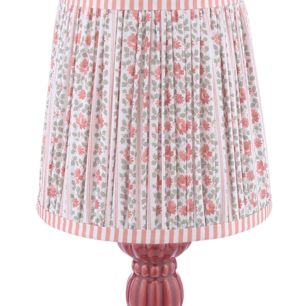 La lámpara de mesa Kelbrook destaca por su diseño lleno de vida y encanto inglés. Su base de cerámica esmaltada en rojo presenta una silueta clásica con volumen y un brillo elegante. La pantalla plisada, con un delicado estampado floral sobre fondo blanco y detalles a rayas, completa el conjunto con un aire romántico y alegre. Ideal para dar un toque cálido y colorido a mesillas o consolas.