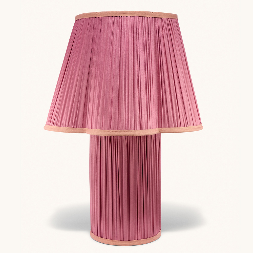 La lámpara de mesa Myra Grande Fucsia combina seda y viscosa en un intenso tono fucsia con pantalla plisada. Elegante y vibrante, es perfecta como lámpara de salón, mesilla o entrada, aportando color y sofisticación a la decoración.