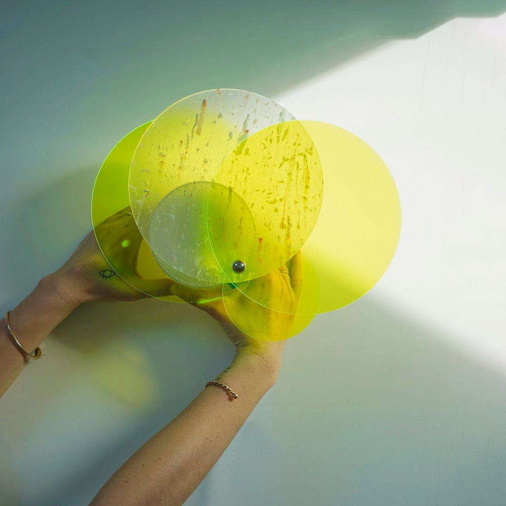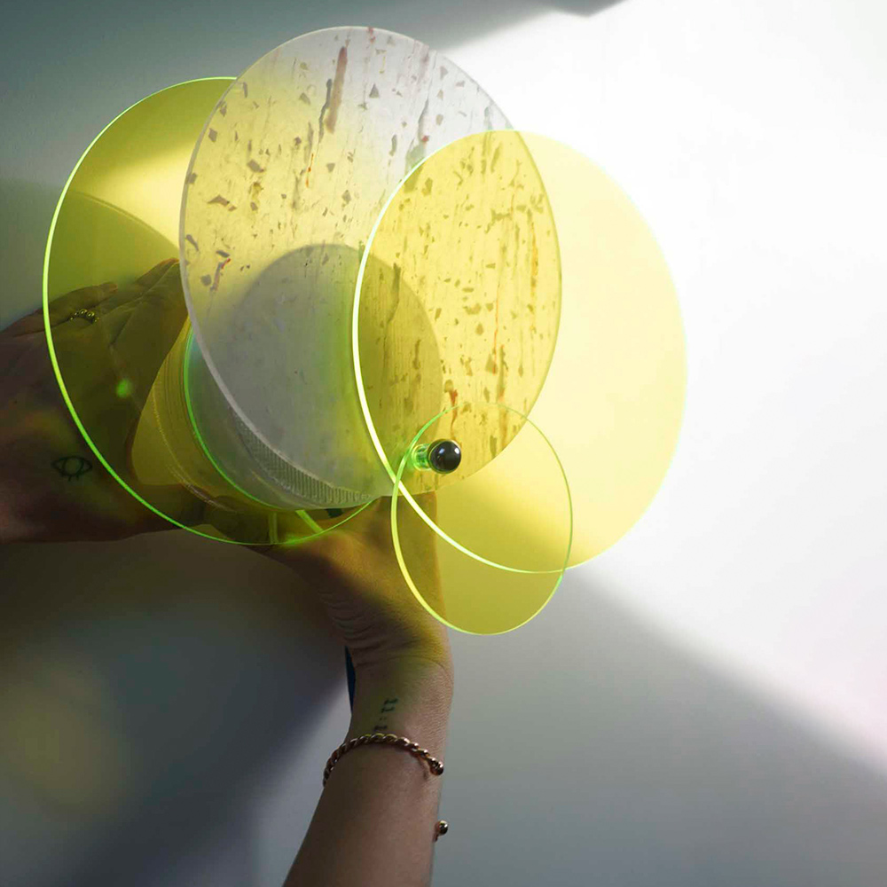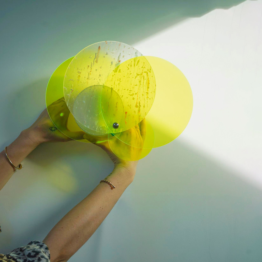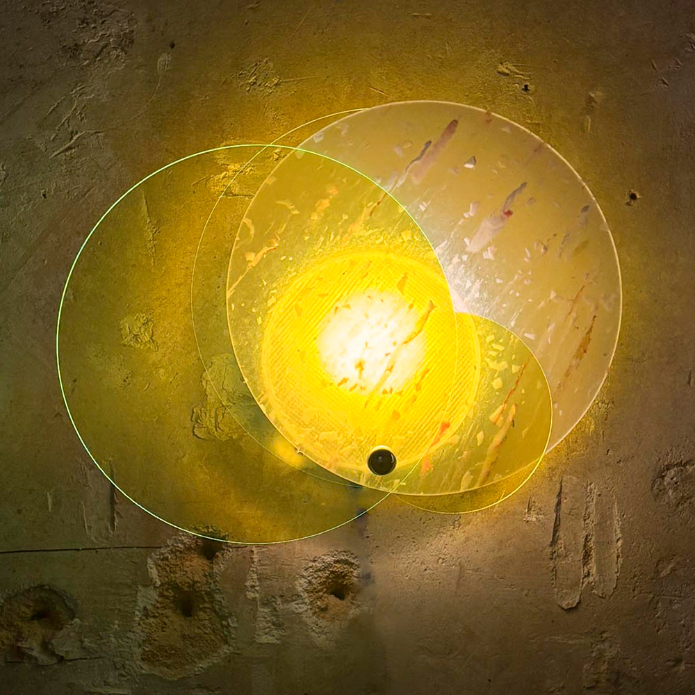 Halo invita a jugar con la luz: sus discos translúcidos generan reflejos suaves y matices vibrantes que transforman el ambiente según la orientación y la superposición de los colores.
