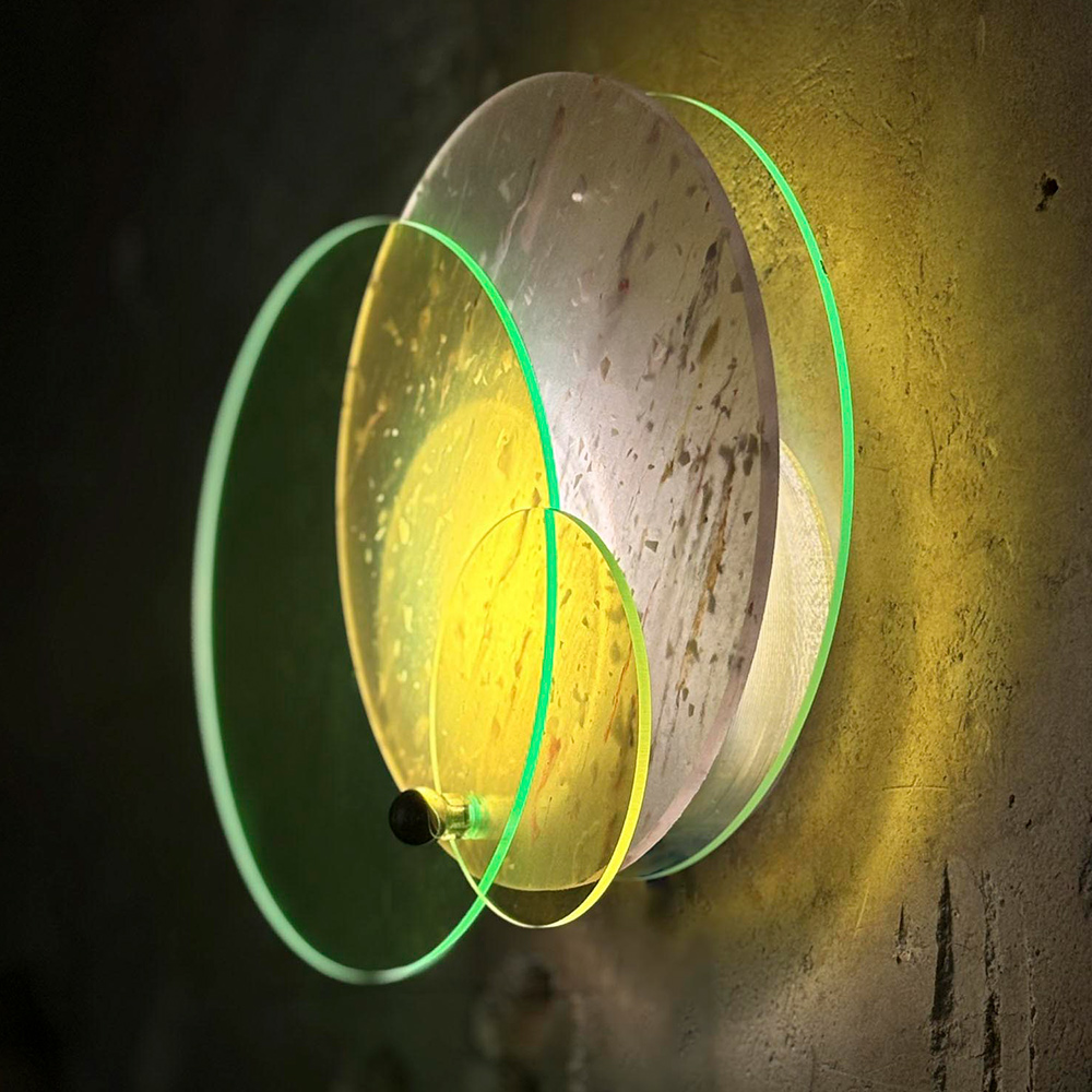 Su diseño modular se compone de cuatro discos —tres de color y uno texturizado— que pueden girar 360° para crear diferentes efectos de luz y color. Gracias a su estructura versátil, puede colocarse sobre una superficie o colgarse en la pared
