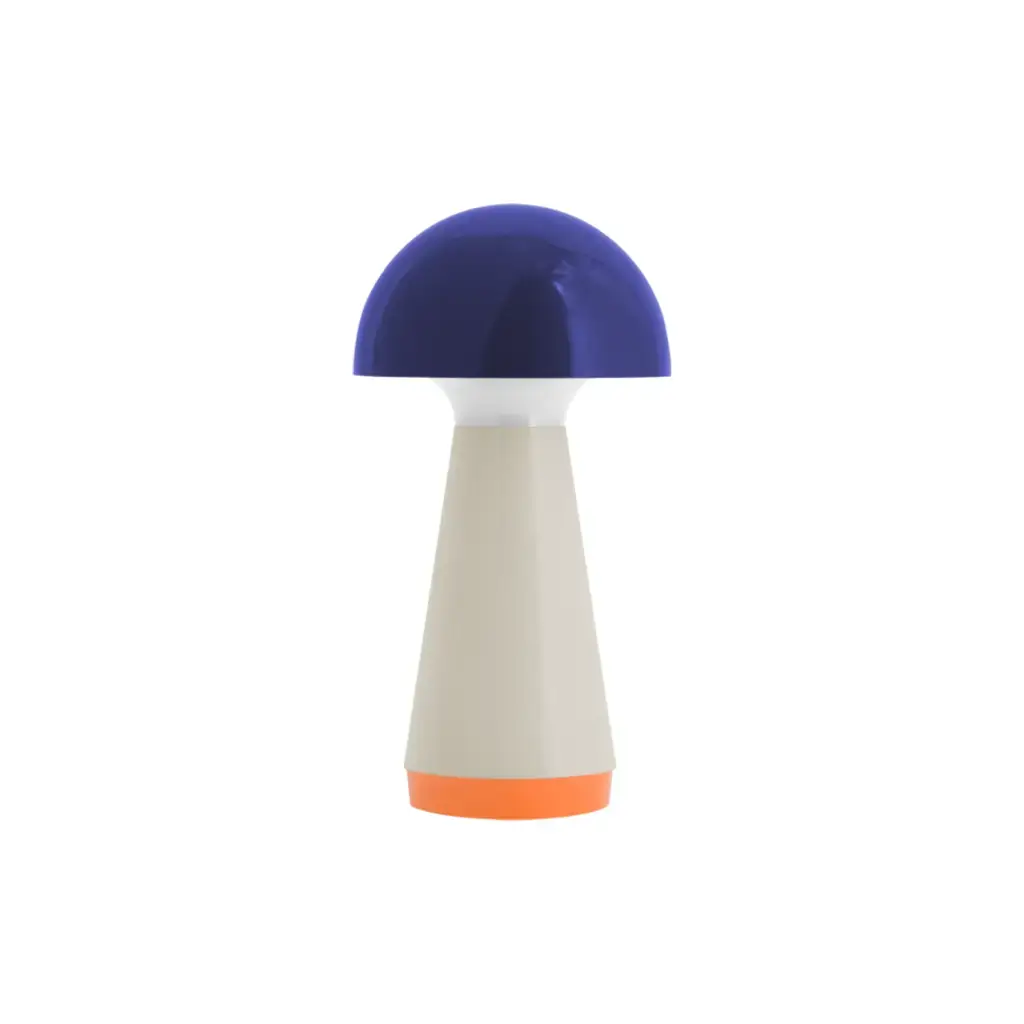 Lámpara portátil inalámbrica en formato compacto con el icónico diseño tipo seta. En esta versión, la pantalla en color azul se combina con un cuerpo en topo y una base en naranja, creando una pieza moderna, divertida y muy fácil de integrar en cualquier rincón.