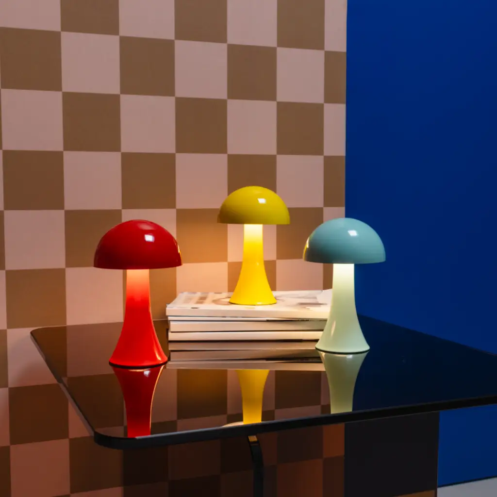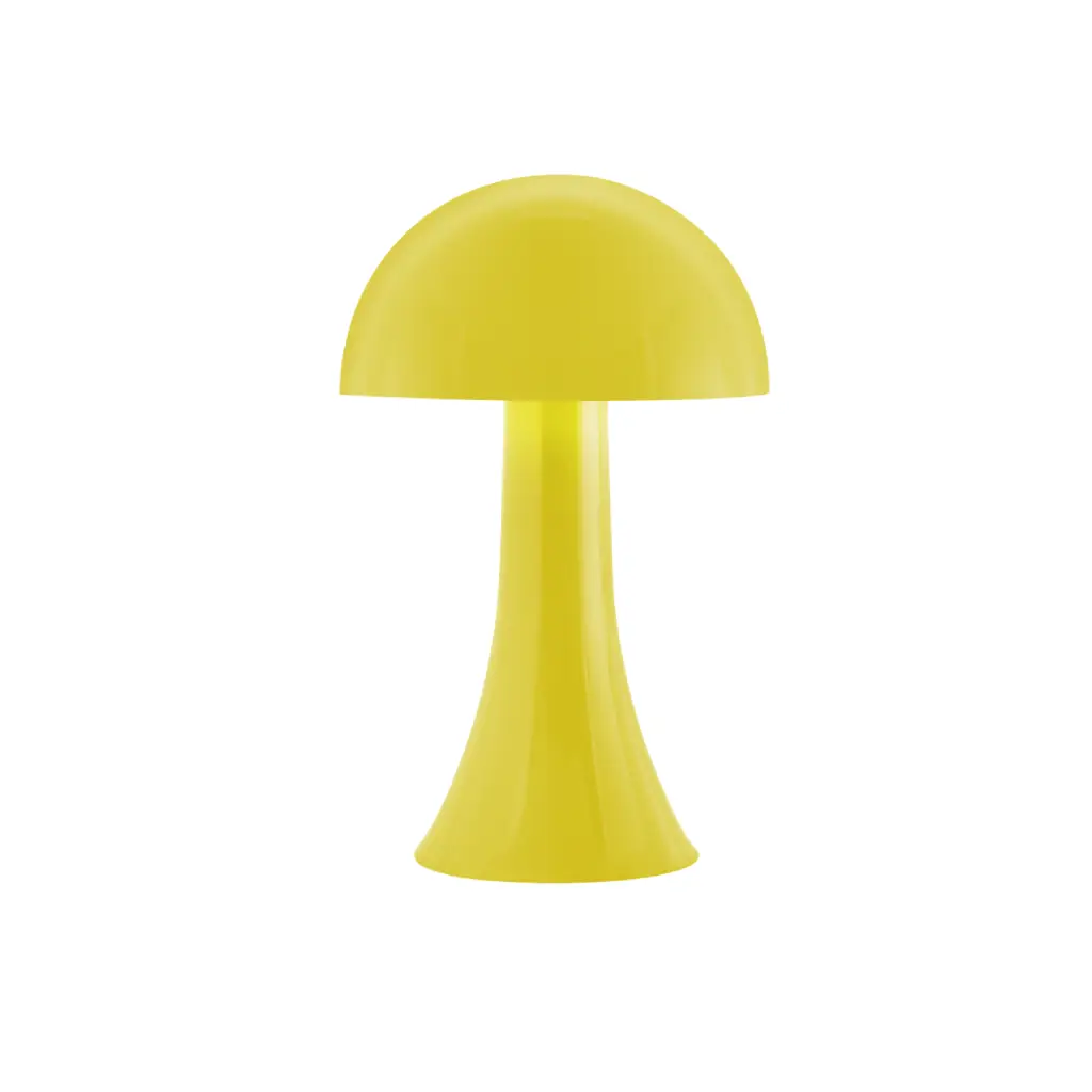 Lámpara inalámbrica mini de estética desenfadada y muy decorativa, con una forma redondeada tipo seta que no pasa desapercibida. El acabado amarillo le da muchísima personalidad y la convierte en una opción ideal para añadir luz y color en una balda, una mesa auxiliar o incluso en una zona exterior resguardada. Está realizada en metal y PP, con un acabado liso y brillante que refuerza su aspecto contemporáneo.