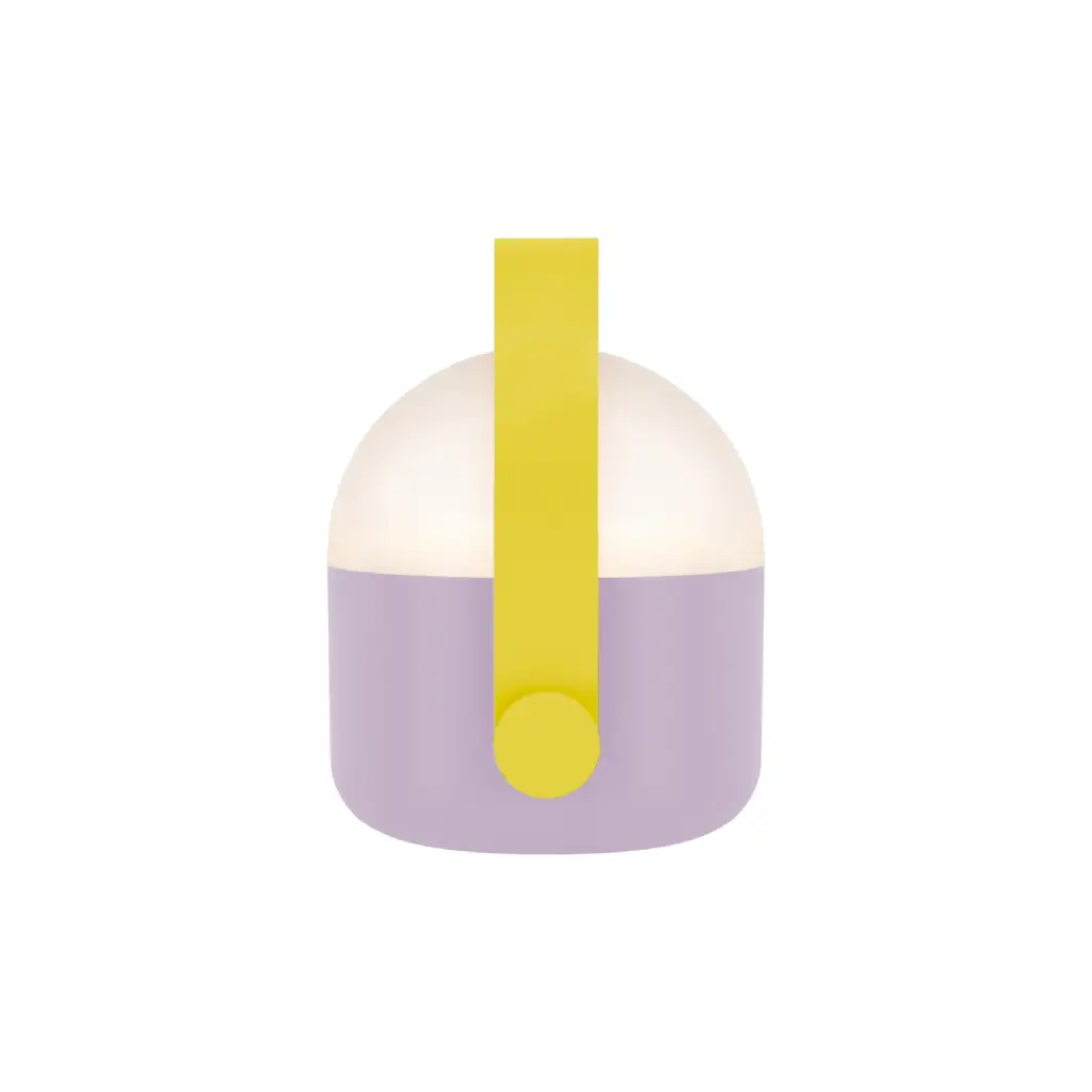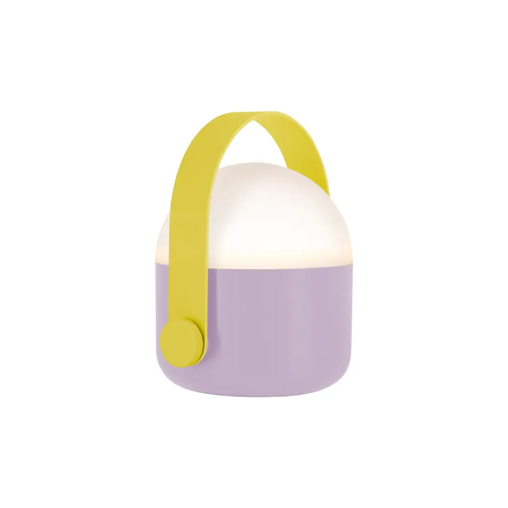 Lámpara portátil inalámbrica de diseño actual y muy decorativo, perfecta para quienes buscan un toque diferente en la iluminación. Su acabado en tono lila aporta suavidad y originalidad, ideal para espacios creativos, dormitorios o rincones especiales. Fabricada en plástico y metal, resulta ligera y resistente.