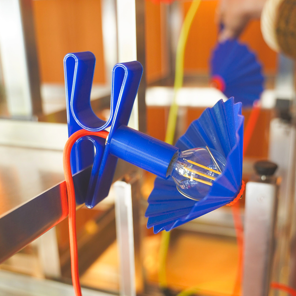 La lámpara Parasol Azul de Rayon Vert Studio combina diseño atrevido y sostenibilidad en una pieza única. Fabricada en Francia mediante impresión 3D, utiliza materiales reciclados y bioplásticos de origen vegetal. Su pinza bilaterial permite colocarla fácilmente sobre estanterías, mesas o cabeceros, adaptándose a diferentes grosores.