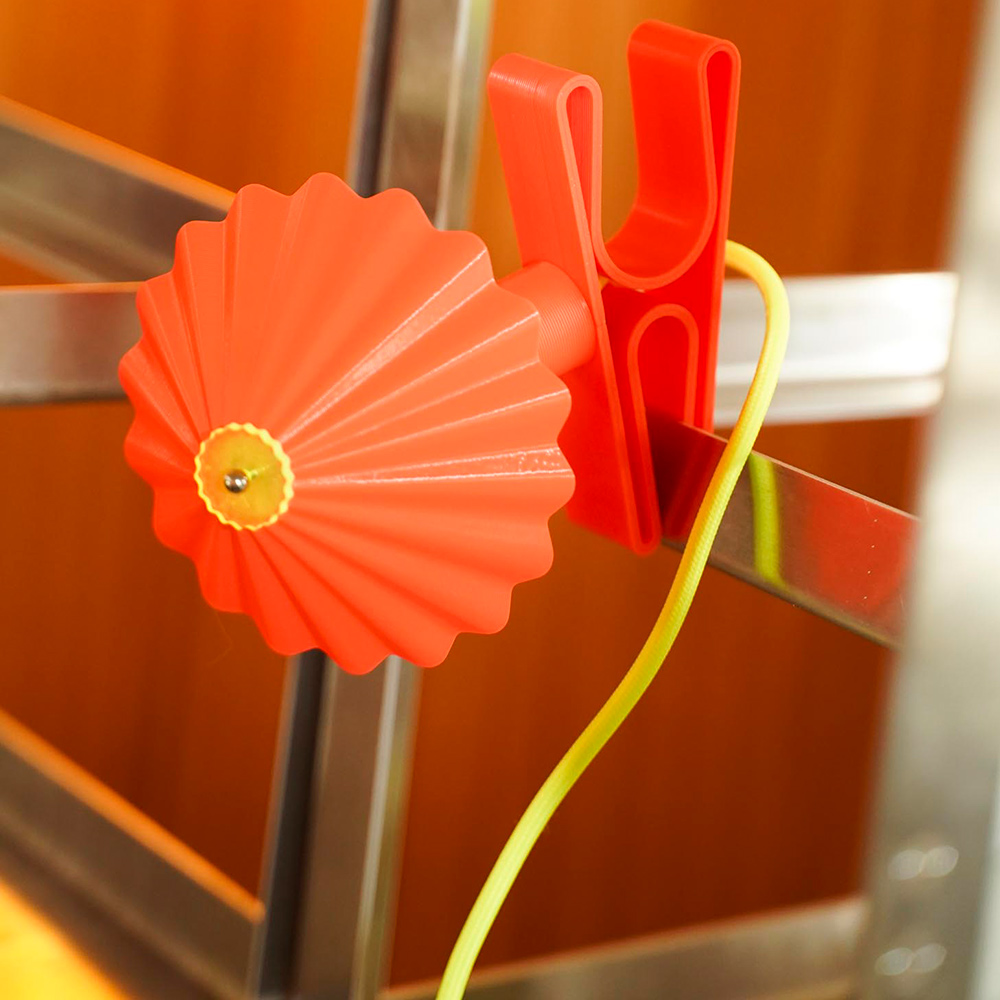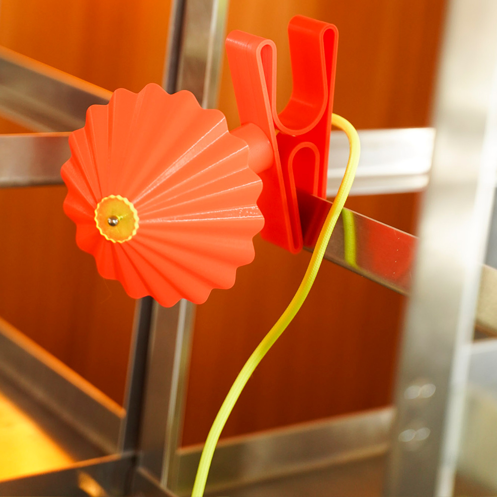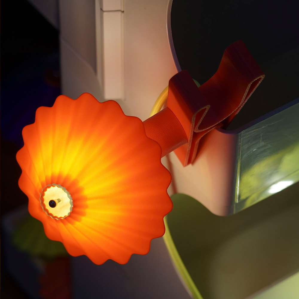 La lámpara Parasol Naranja de Rayon Vert Studio une diseño, color y sostenibilidad. Fabricada en Francia con materiales reciclados y bioplásticos, su sistema de pinza permite colocarla fácilmente en estanterías o mesillas.