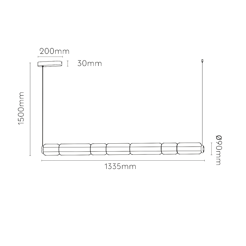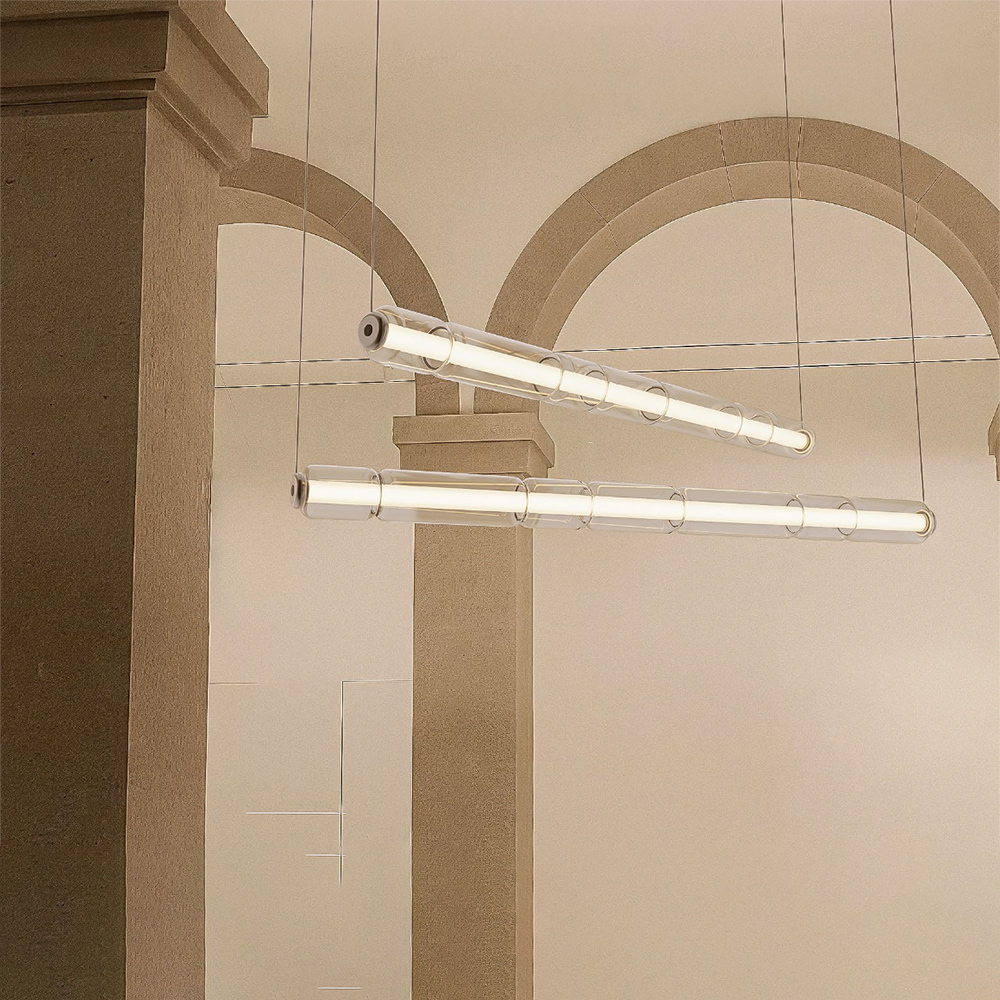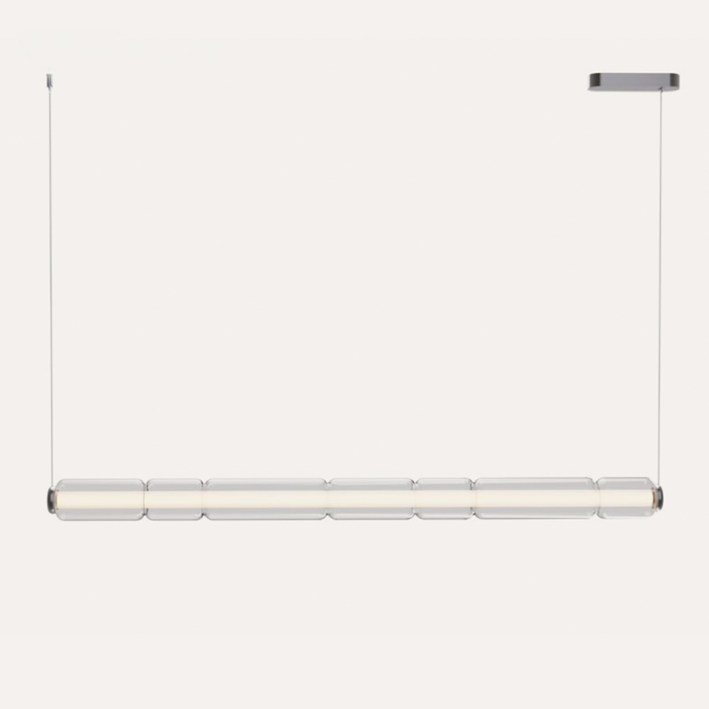 La lámpara suspendida VENUS traslada la estética sensorial de la colección a un formato lineal y arquitectónico. Su estructura de vidrio transparente envuelve la fuente de luz generando una secuencia rítmica de volúmenes que aportan ligereza visual y una presencia elegante sobre mesas o islas.
