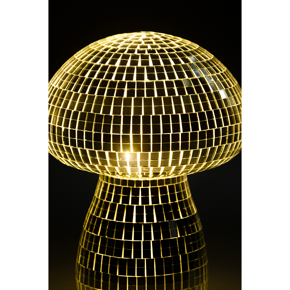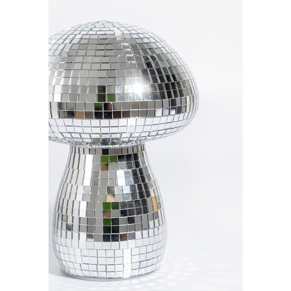 Una pequeña lámpara de noche con alma disco. Una luz de ambiente cálida con forma de seta, recubierta de pequeños espejos que reflejan la luz y proyectan destellos suaves y relajantes en las paredes. Compacta, decorativa y con un diseño retro-futurista irresistible, esta lámpara a pilas es perfecta para dar un toque divertido y acogedor a dormitorios infantiles, estanterías o rincones especiales.