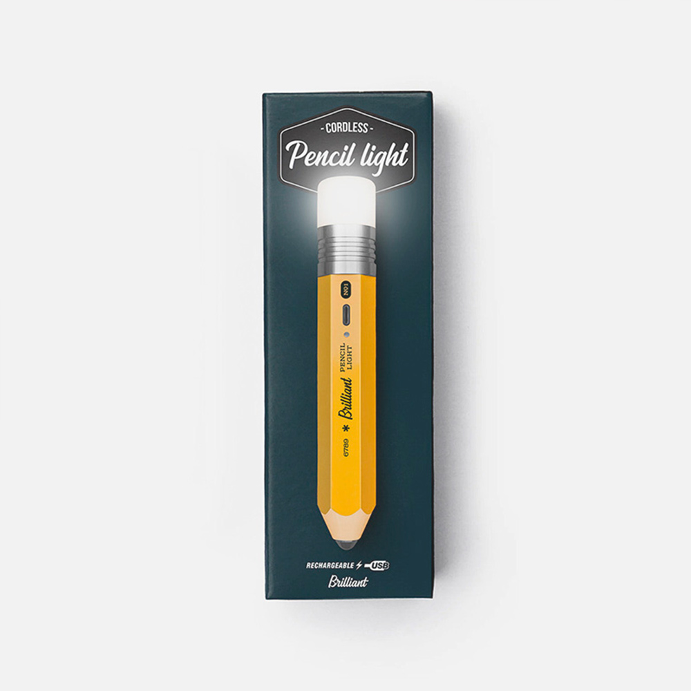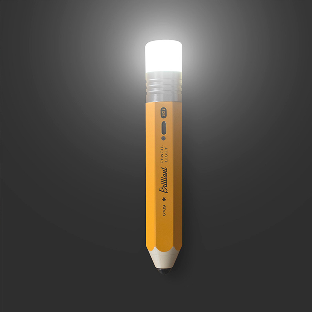 Linterna recargable con forma de lápiz clásico. La goma es la luz y la mina funciona como interruptor. Ideal como linterna práctica o lámpara decorativa.
