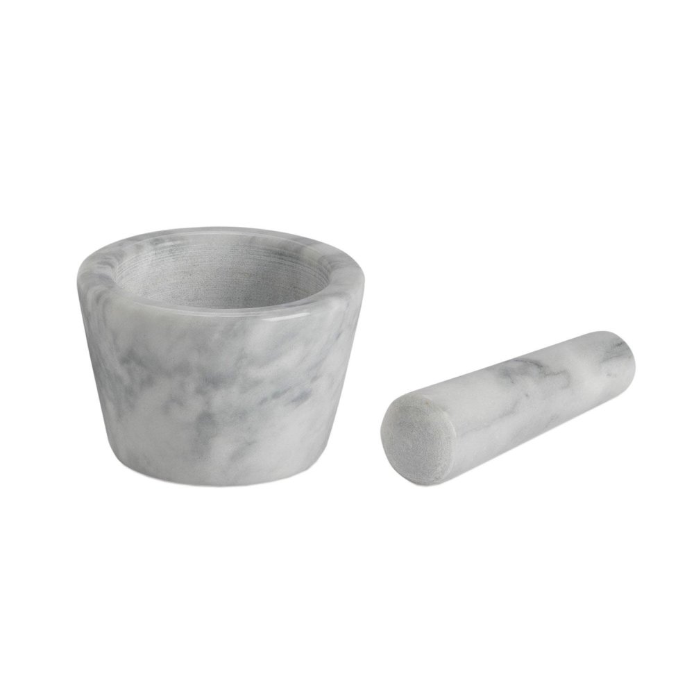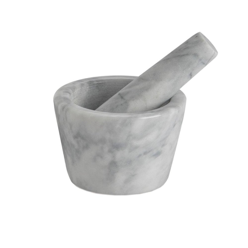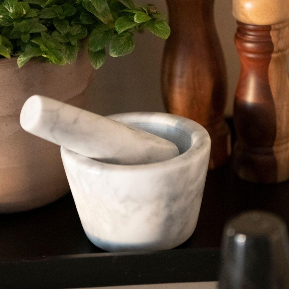 Mortero de mármol en tonos blanco y gris veteado, una pieza atemporal que combina funcionalidad y belleza natural. Su forma ligeramente cónica aporta estabilidad y comodidad en el uso, mientras que la mano de mortero, también en mármol, encaja perfectamente en el conjunto.