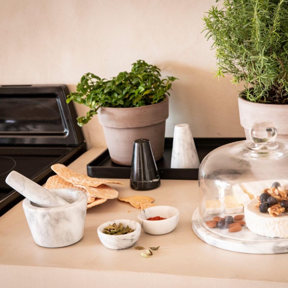 El mármol es una piedra natural, lo que significa que cada pieza presenta un veteado único. No hay dos iguales: las vetas grises dibujan formas distintas en cada mortero, convirtiéndolo en un objeto especial tanto para cocinar como para decorar.