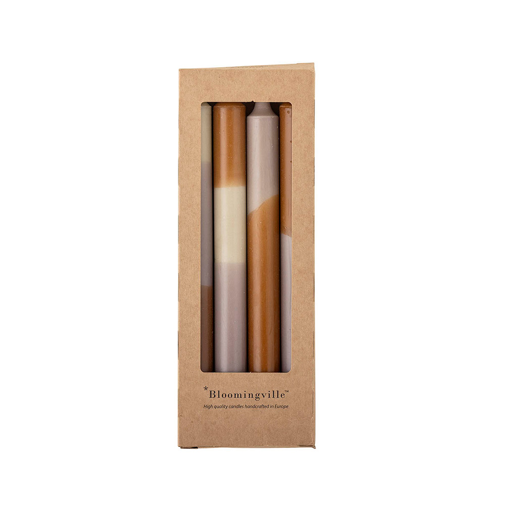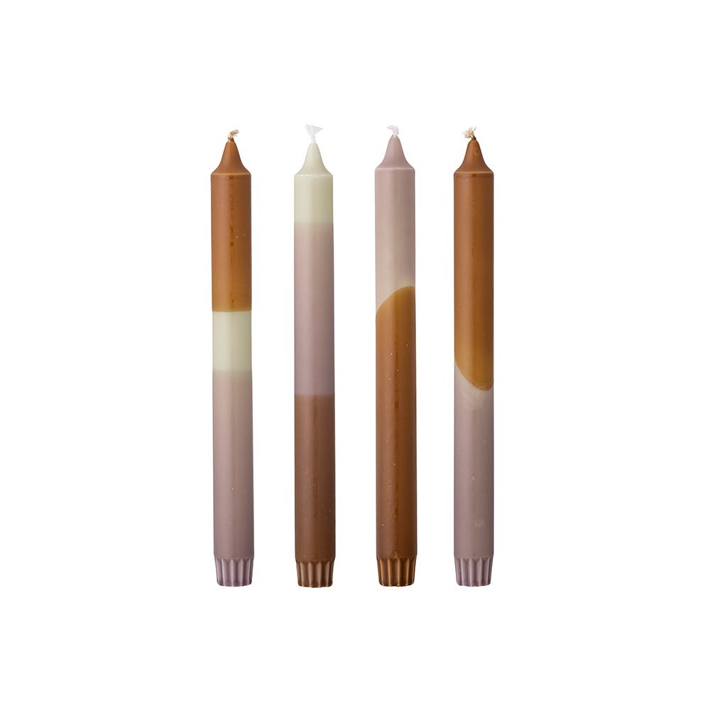 Set de 4 velas Dip Dye de Bloomingville, elaboradas en parafina y pintadas a mano en tonos morados y tierra. Cada vela es única y tiene una duración de 9 horas.