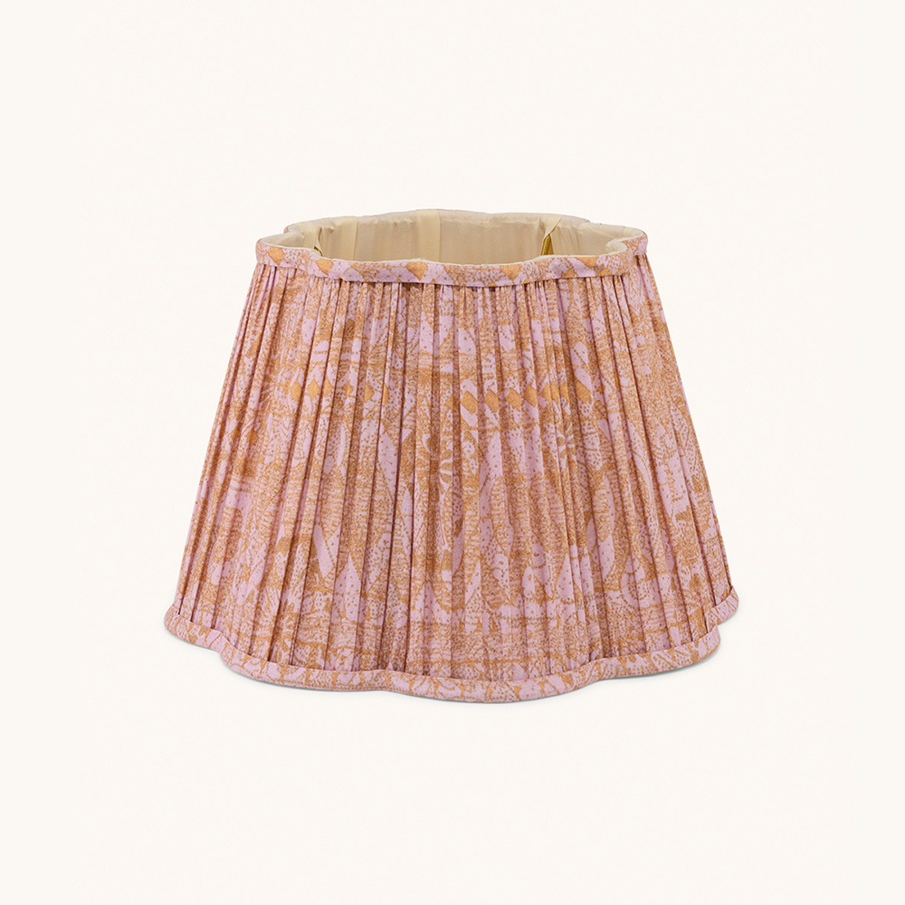 La pantalla de lámpara Diya, confeccionada en algodón estampado a mano en tonos rosas y naranjas, aporta un toque alegre y acogedor con su borde ondulado. Perfecta para mesitas de noche, salones o habitaciones infantiles.