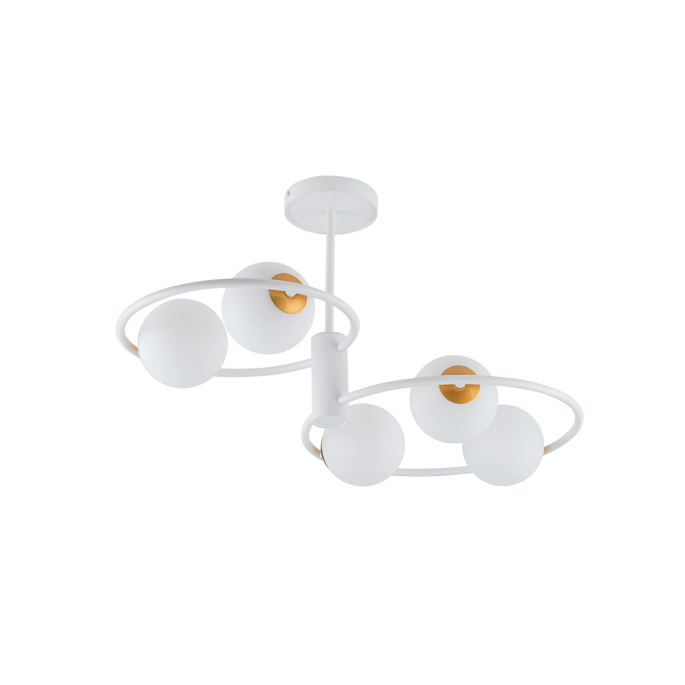 Lámpara plafón de techo con diseño contemporáneo y elegante. Su estructura de metal con acabado en blanco y detalles en oro mate aporta un aire sofisticado a cualquier espacio. Las cinco esferas de cristal opal proporcionan una iluminación uniforme y agradable, ideal para dormitorios.