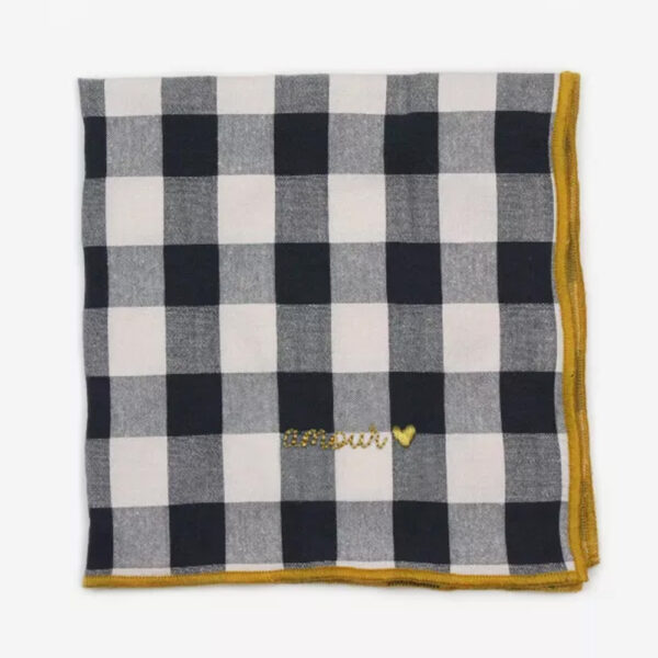 Servilletas de cuadros vichy en negro con ribete mostaza y bordado delicado. Fabricadas con materiales reciclados certificados, estas servilletas son ideales para mesas llenas de personalidad y estilo.
