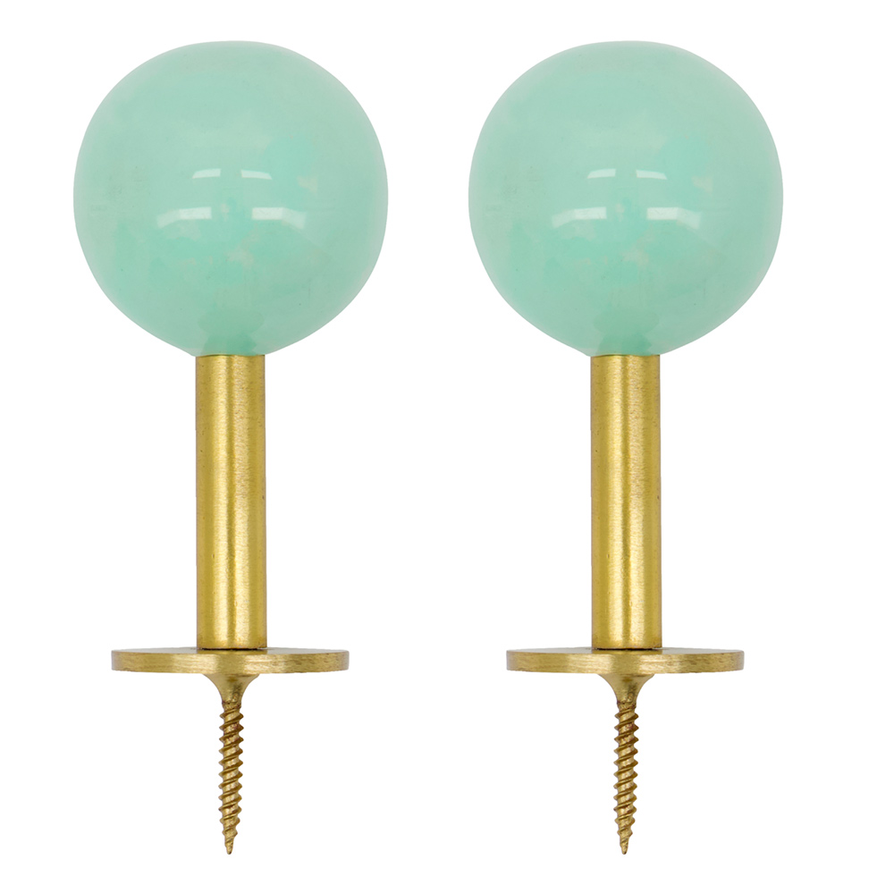 Set de 2 perchas de pared en verde agua y latón. Con diseño redondo y brillante, fabricadas en acrílico e hierro, aportan frescura y estilo mientras resultan prácticas para organizar bolsos, bufandas o toallas.