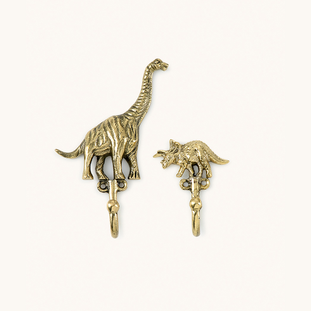 Set de 2 ganchos de latón reciclado hechos a mano, con formas de dinosaurio. Resistentes y decorativos, ideales para habitaciones infantiles o para añadir un toque divertido a cualquier espacio.
