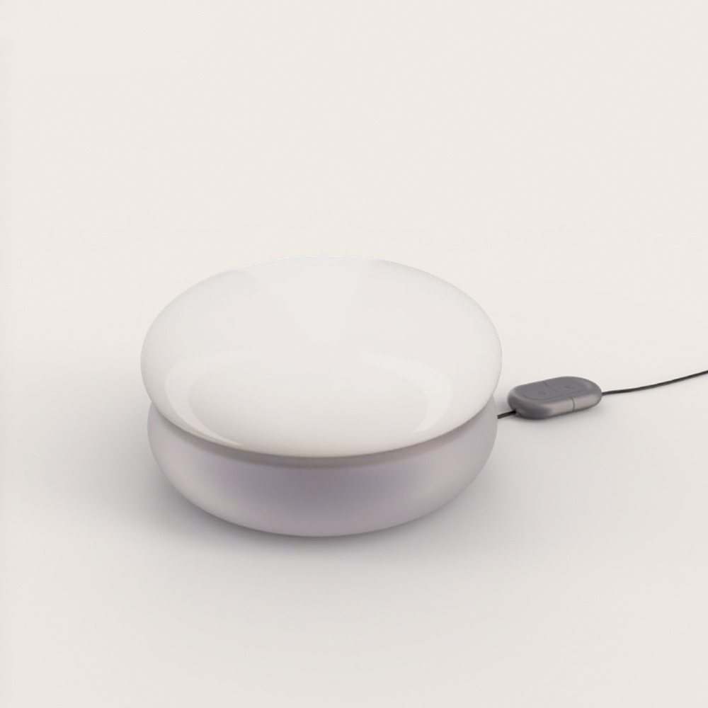 La lámpara de sobremesa EOS, inspirada en la diosa del amanecer, se presenta como una pieza minimalista y emocional donde la luz es la verdadera protagonista. Su diseño bajo y compacto, con pantalla de vidrio blanco y base iridiscente, crea un efecto envolvente y delicado que aporta serenidad al espacio.