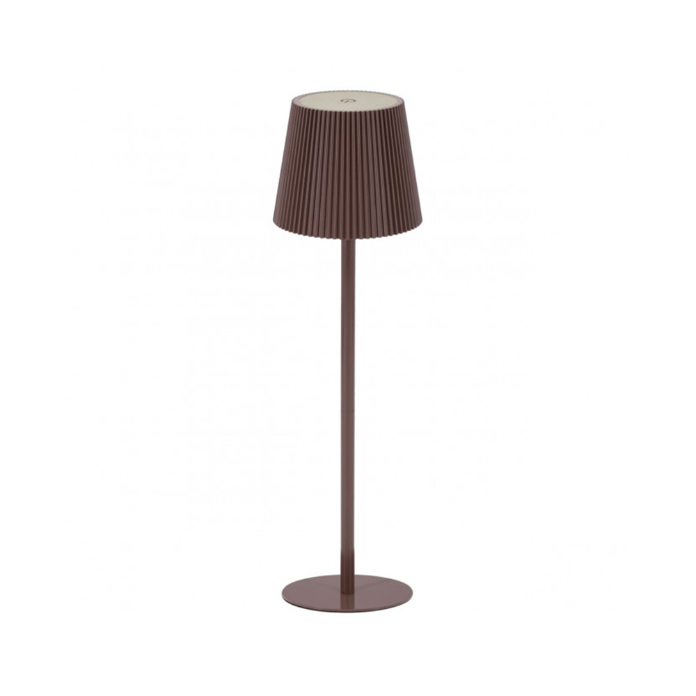Lámpara LED inalámbrica con diseño ajustable en altura (de 25 cm a 115 cm). Fabricada en acrílico y metal, con acabado marrón. Incluye regulador de intensidad y batería recargable con 6 horas de autonomía. Perfecta para ambientes modernos y funcionales.