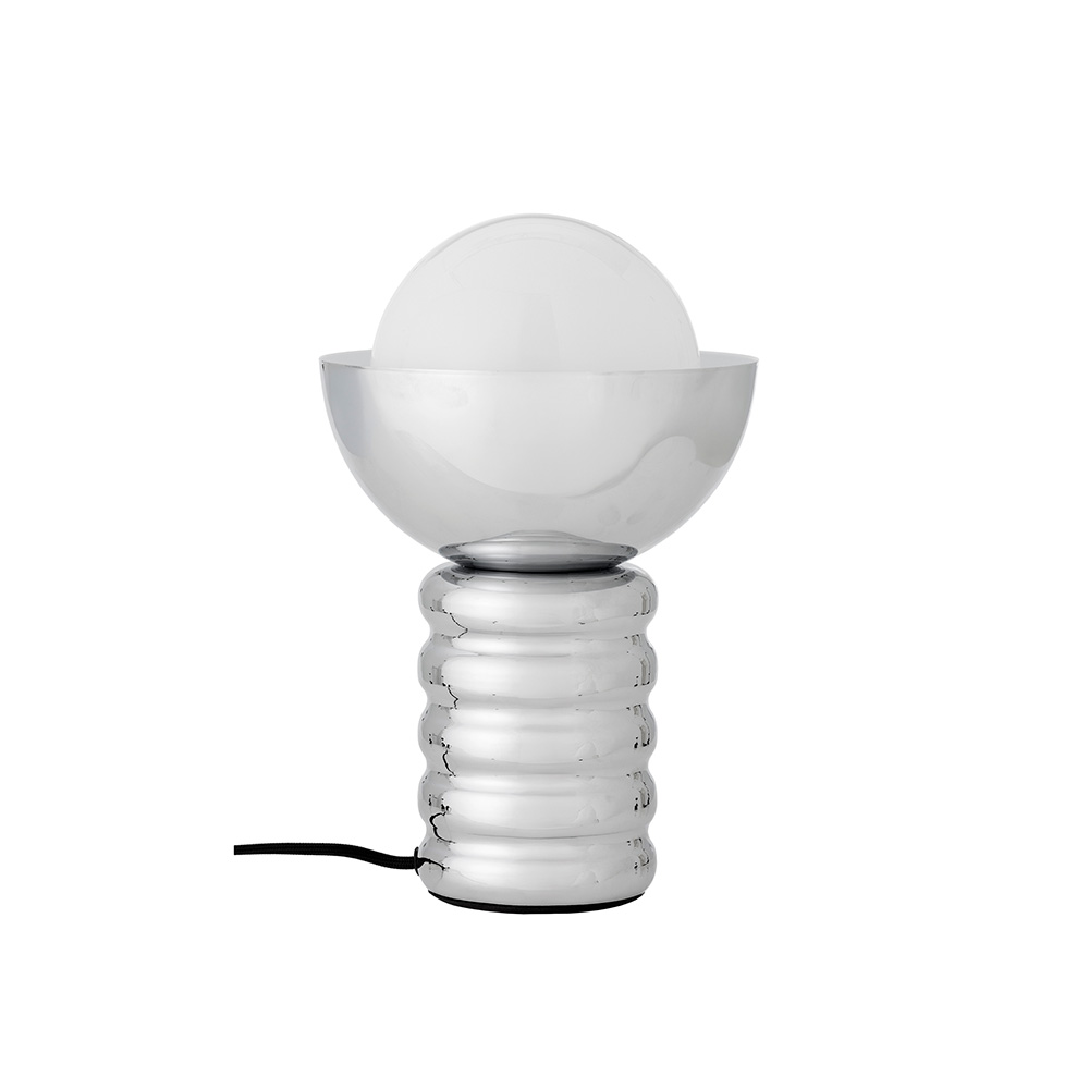 La lámpara de sobremesa Spike destaca por su diseño llamativo y sofisticado. Su base metálica con acabado cromado brillante y su tulipa esférica de vidrio opal aportan un aire contemporáneo y elegante. Perfecta para colocar en una mesita de noche o rincón, combina iluminación y decoración en una sola pieza.