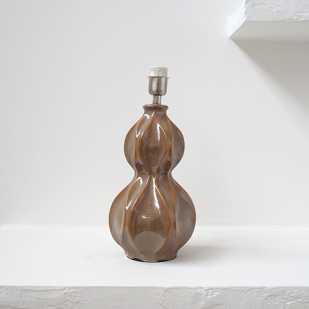 Lámpara de sobremesa con base de cerámica esmaltada en marrón y diseño escultural. Ideal para mesillas, muebles auxiliares y rincones acogedores.