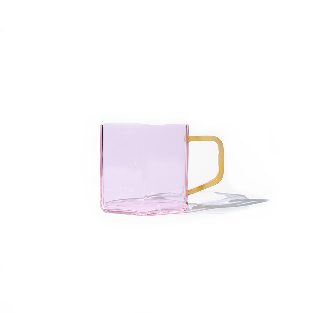 Mug de cristal rosa con diseño geométrico hexagonal, que combina delicadeza y modernidad en una sola pieza. Su acabado transparente resalta su estilo ligero y sofisticado, mientras que el asa en color amarillo aporta un contraste vibrante y contemporáneo. Fabricado en cristal grueso de alta calidad, es robusto y visualmente atractivo, perfecto tanto para uso diario como para añadir un detalle de diseño en tu vajilla.