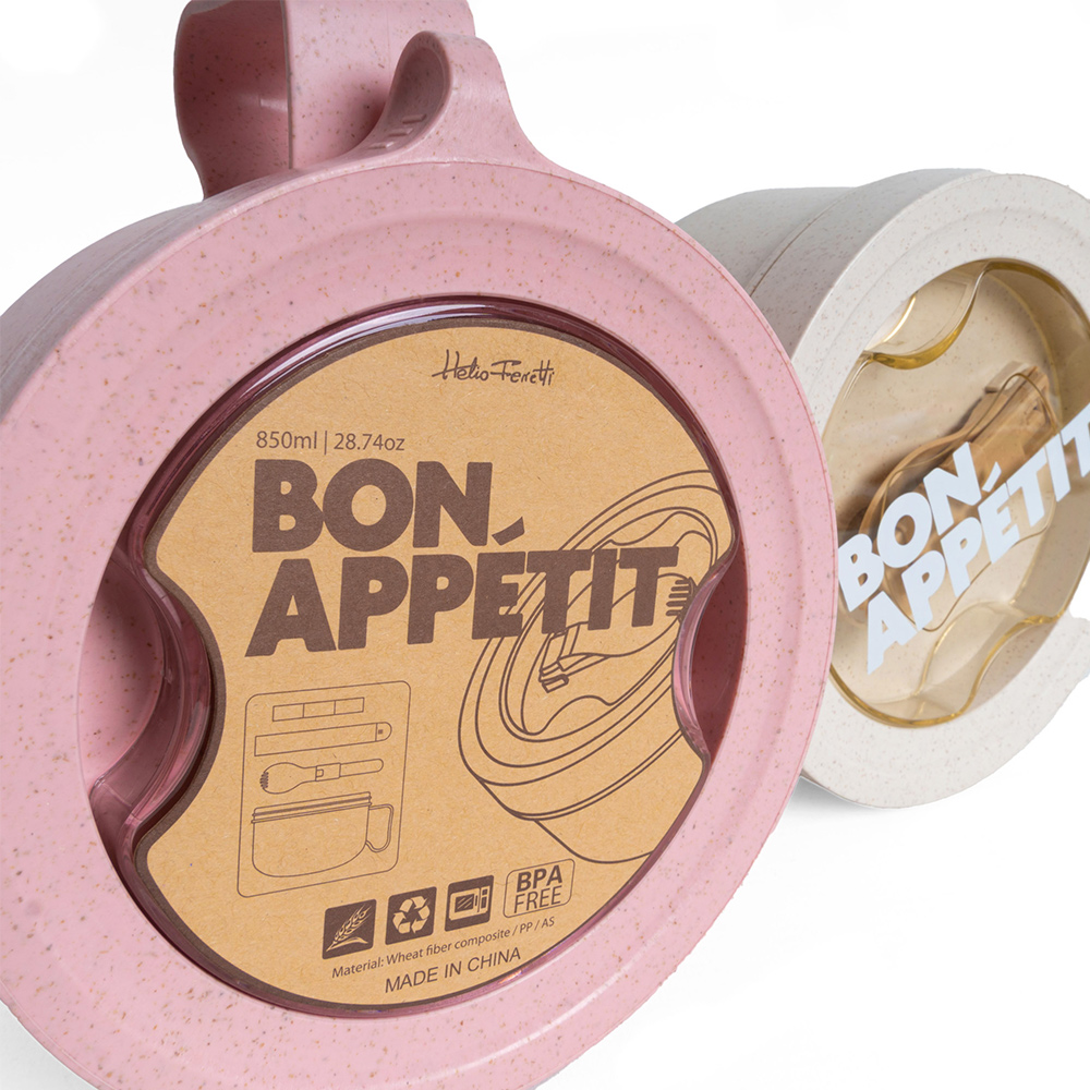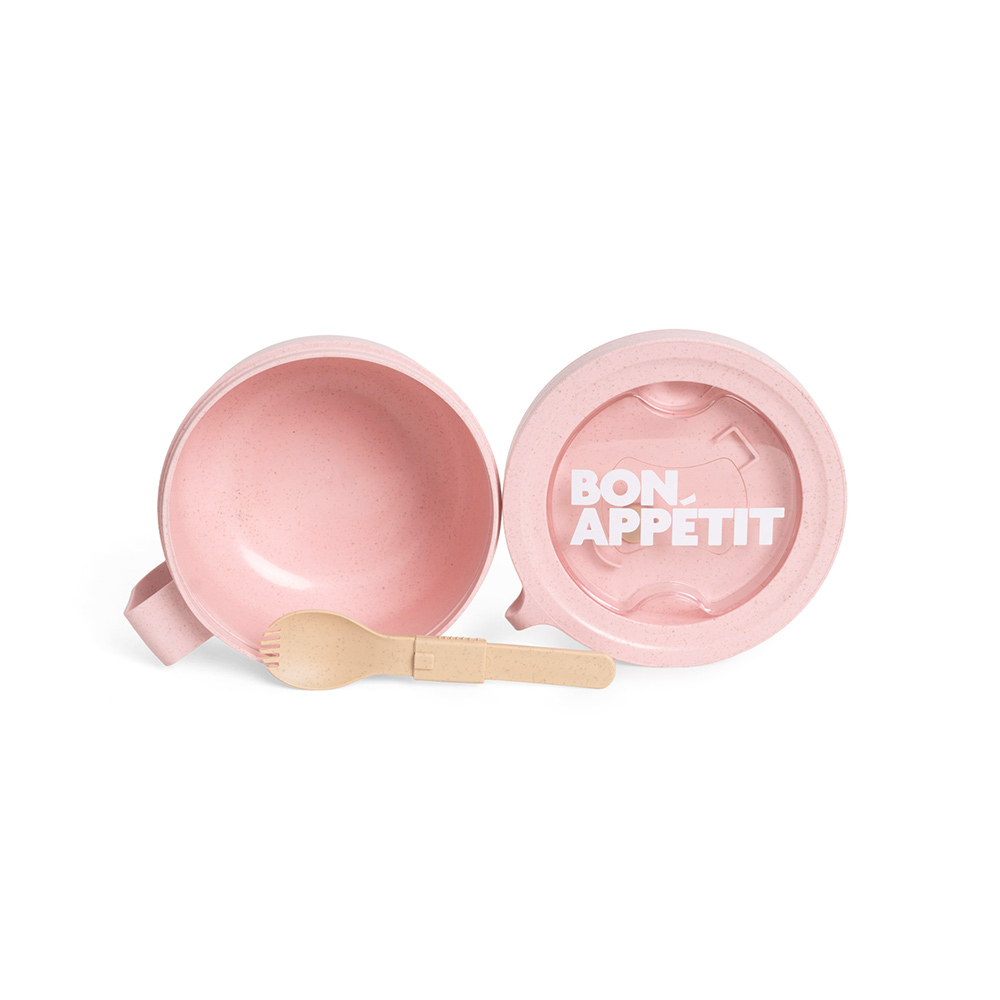 Tupper redondo Bon Appétit en color rosa con tapa hermética y cubierto incluido. Práctico, ecológico y moderno, ideal para transportar comidas de forma cómoda y segura.