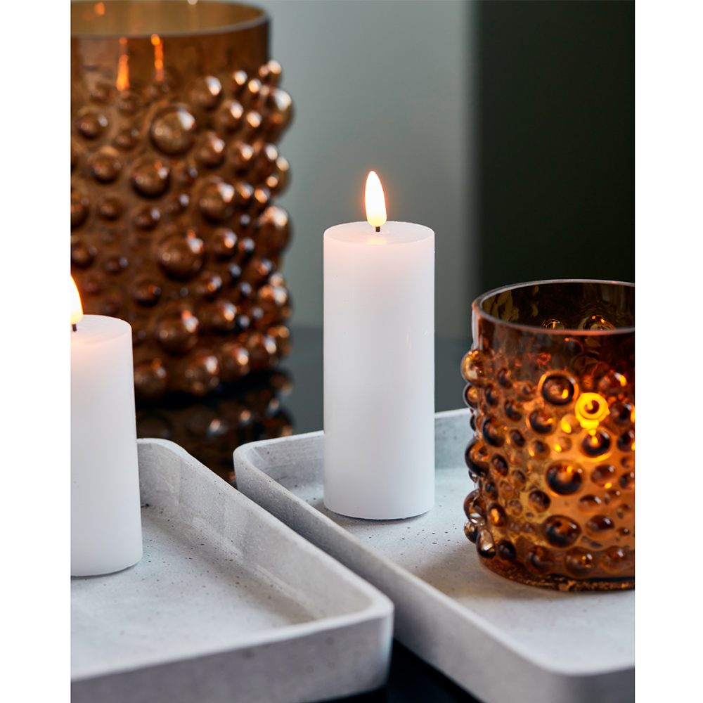 La vela LED blanca mediana de House Doctor es una alternativa práctica y segura a las velas tradicionales. Con un acabado de parafina que imita el aspecto y tacto de la cera real, aporta un brillo parpadeante y cálido que recrea la sensación de una llama auténtica. Incorpora función de temporizador de hasta cinco horas para que disfrutes de una atmósfera acogedora sin preocuparte de apagarla. Perfecta para colocar dentro de un farol, sobre una bandeja decorativa o en un rincón del salón.
